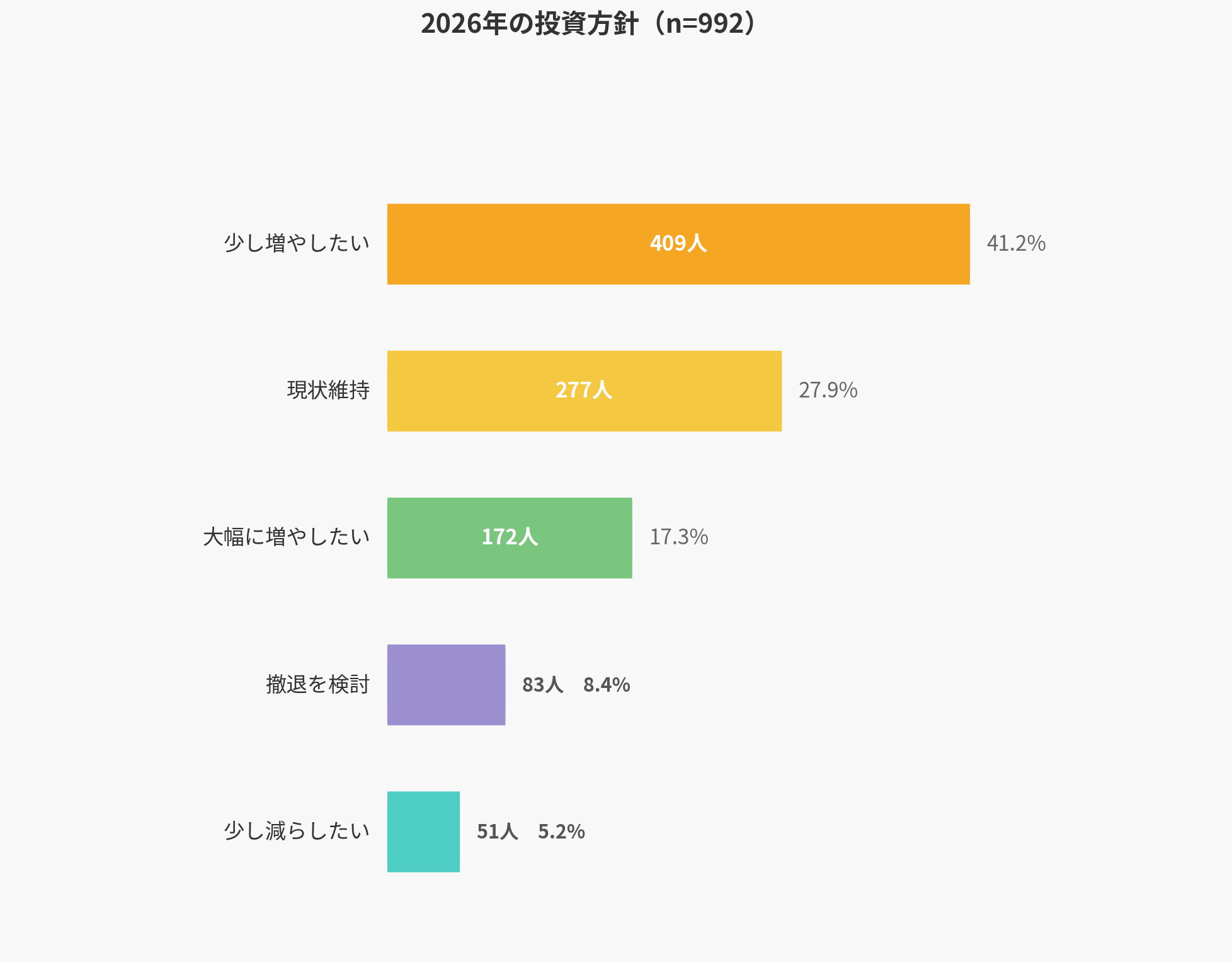 2026年の投資方針を調査したところ、「少し増やしたい(41.2%)」と「大幅に増やしたい(17.3%)」を合わせた投資拡大派が58.5%に達しました。