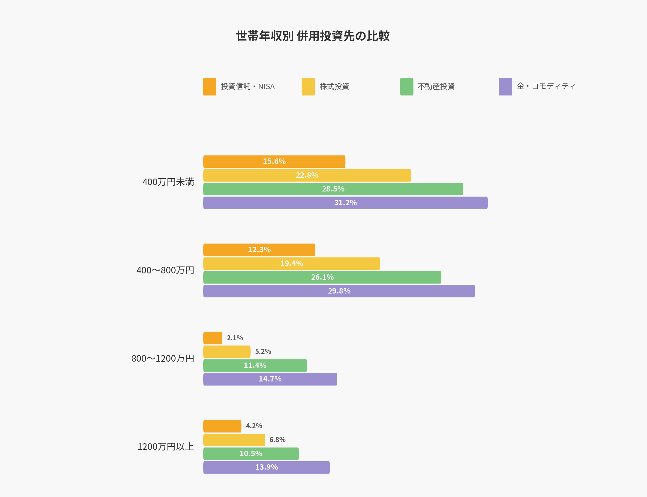 年収800万円以上の層では不動産併用率が11.4%と、年収400万円未満の層(2.1%)と比較して約5倍以上の開きが生じています。