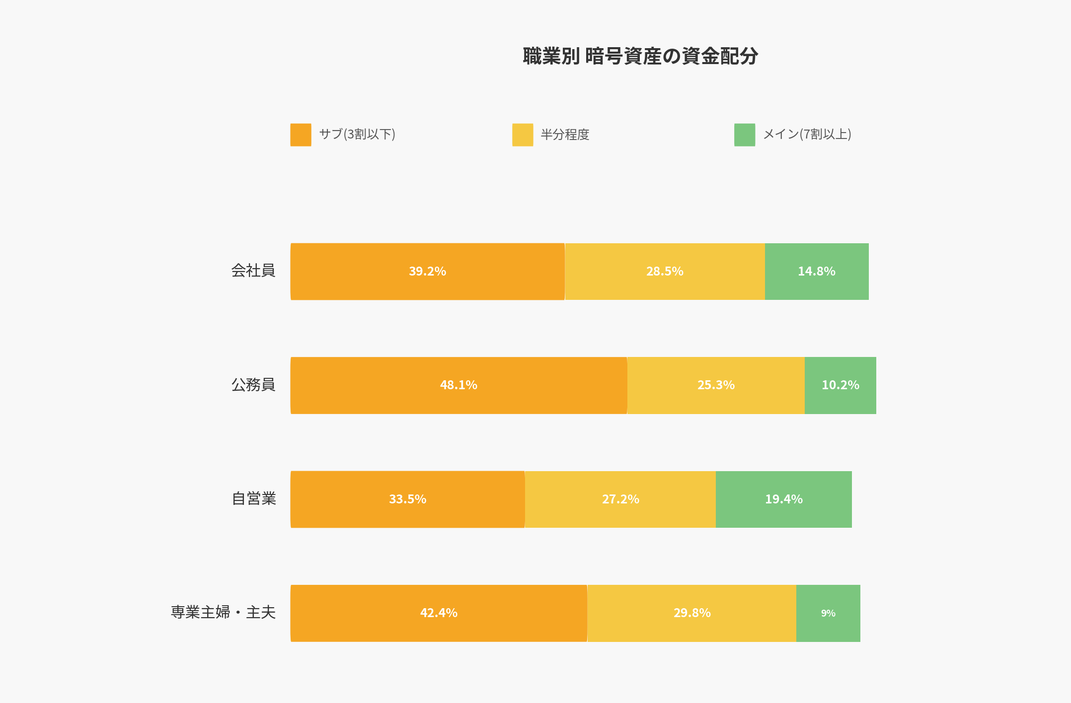 職業 | 仮想通貨サブ(3割以下) | 仮想通貨は半分程度 | 仮想通貨メイン(7割以上) |