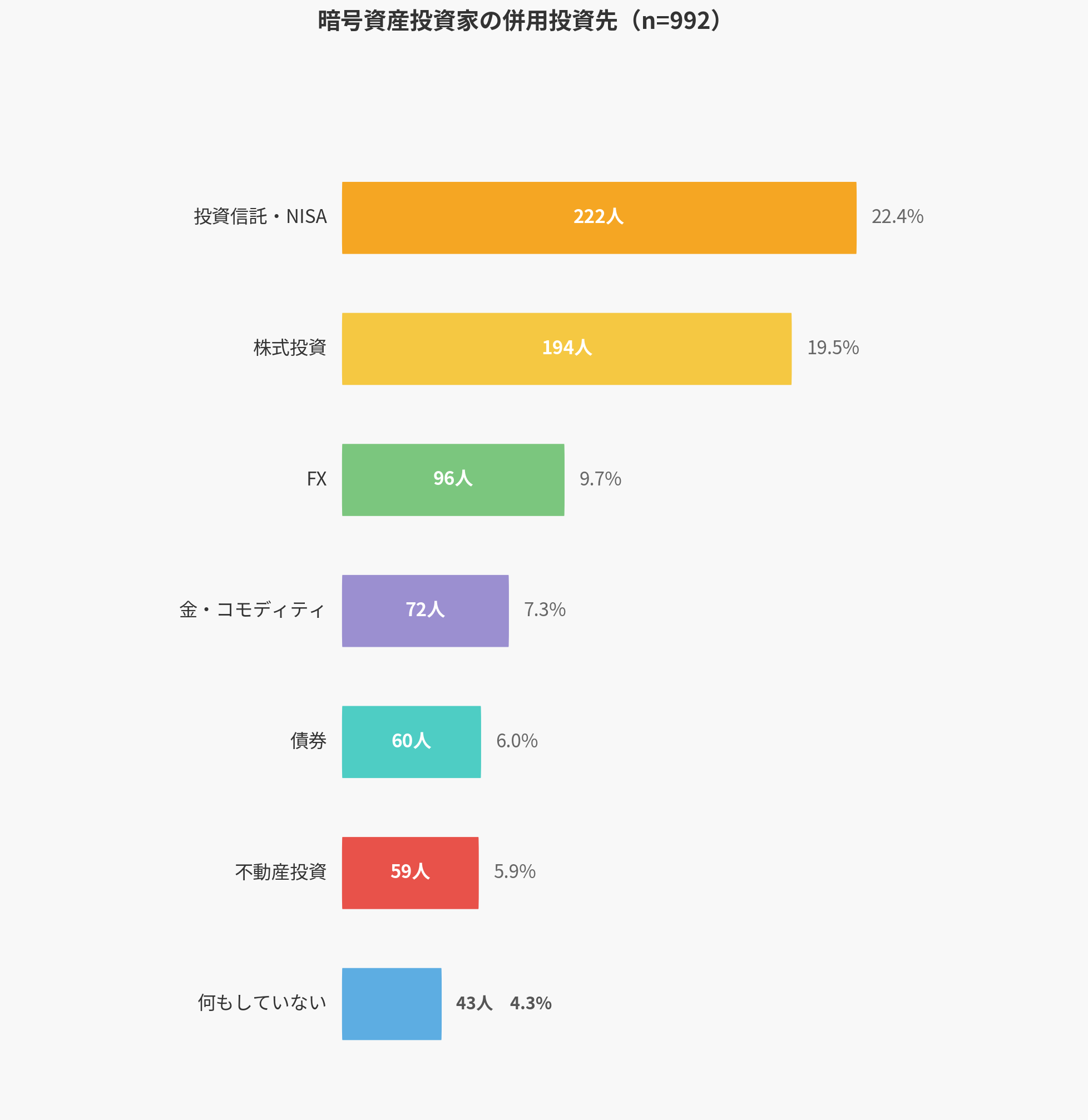 「株式投資」も19.5%と高い併用率を誇り、伝統的な金融資産とデジタル資産を天秤にかけながらポートフォリオを構築している様子が伺えます。