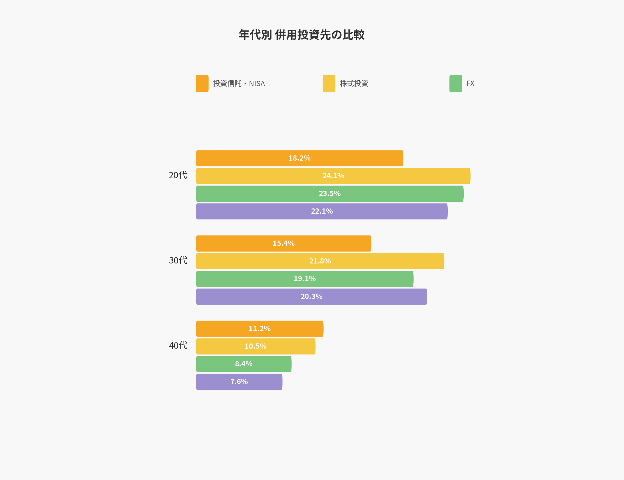 年代別の動向を確認すると、特に30代において投資信託・NISAの活用が24.1%、株式投資が21.8%と、全世代のなかでも積極的な併用姿勢が目立ちます。