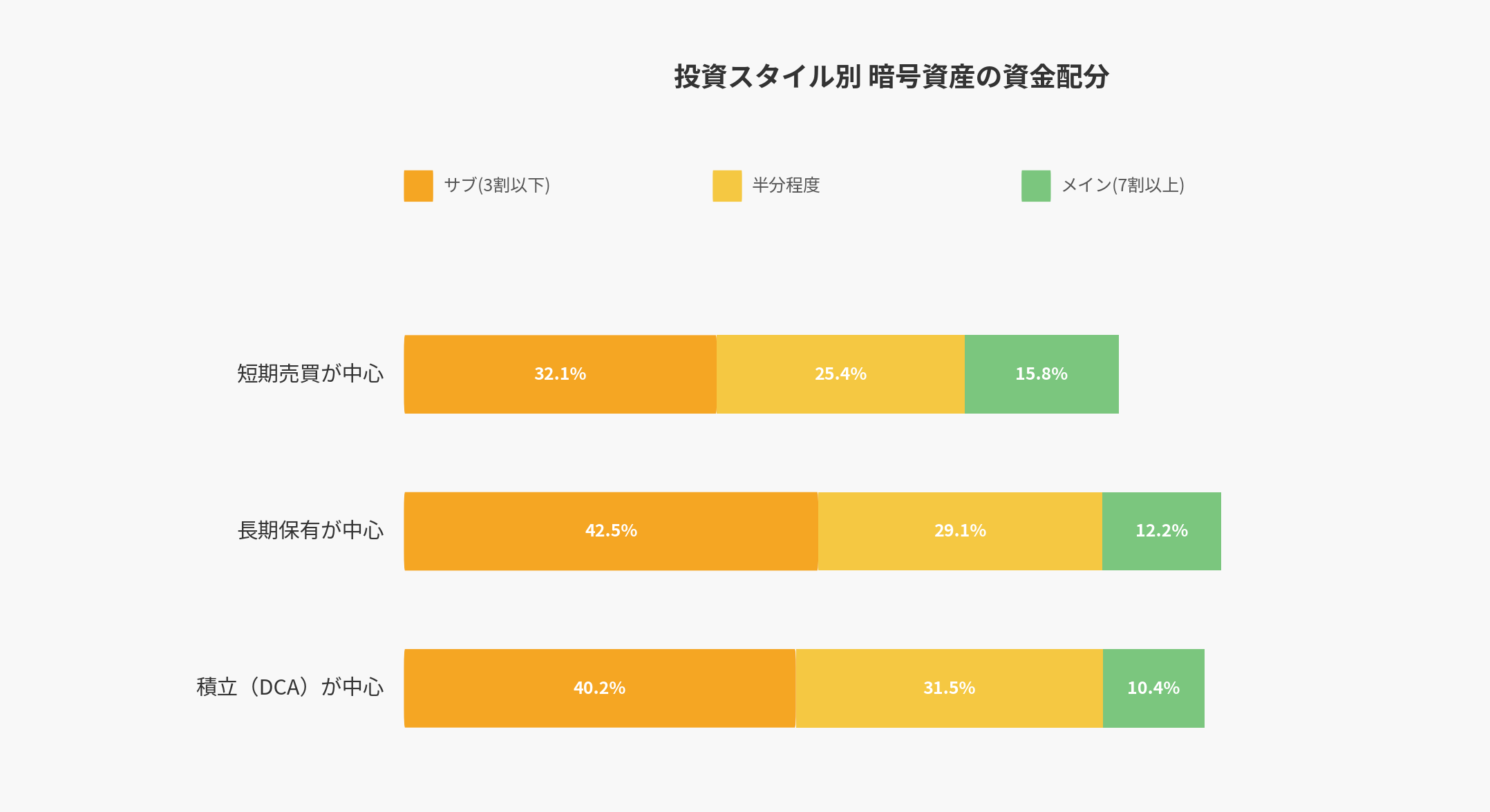 投資スタイル別に資金配分を分析すると、短期売買をメインとする層では「7割以上のメイン運用」が15.8%と、他のスタイルより高い傾向にあります。
