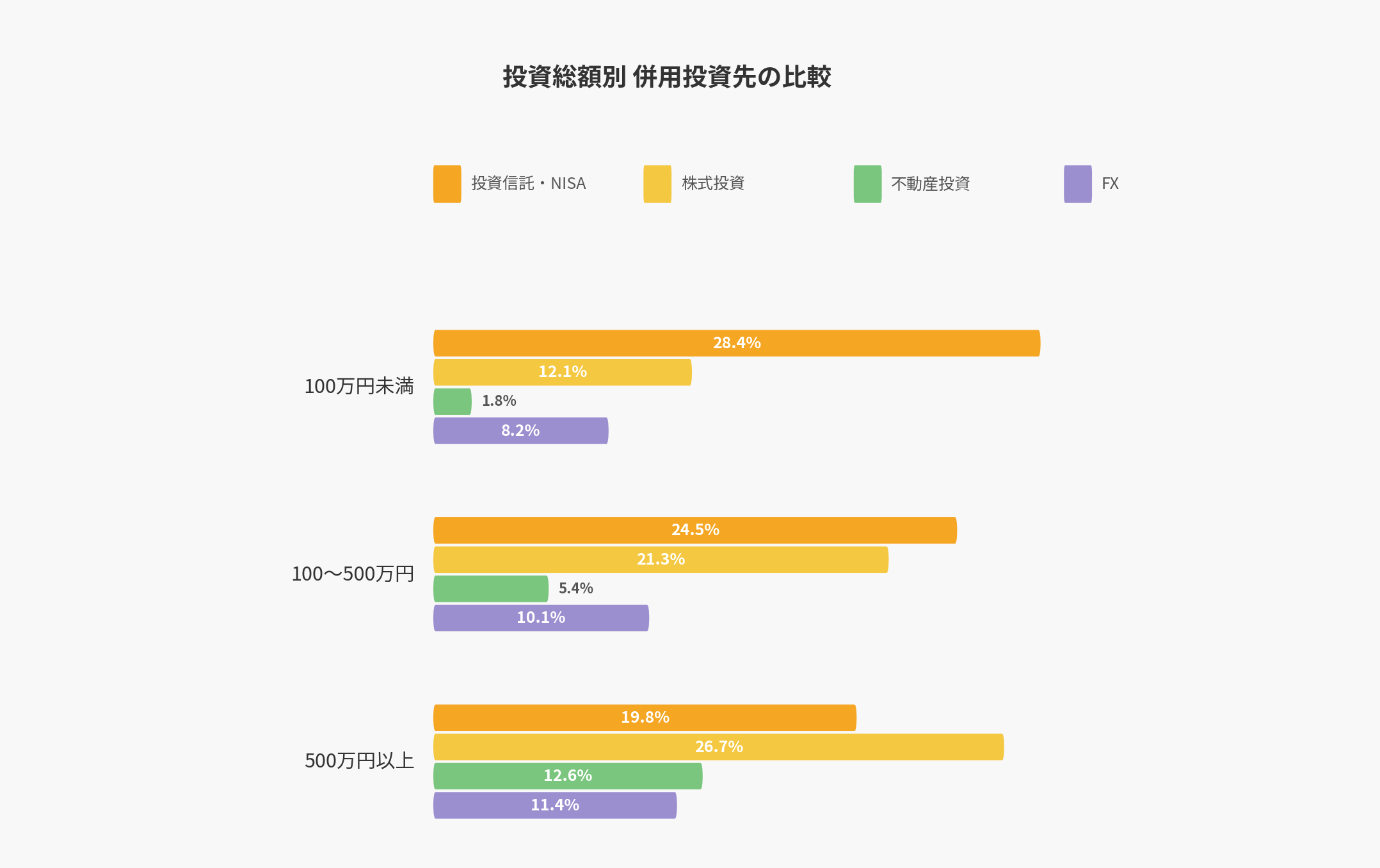 投資総額が100万円に満たない初期段階の投資家においては、NISA・投資信託の併用率が28.4%と最も高い数値を示しました。