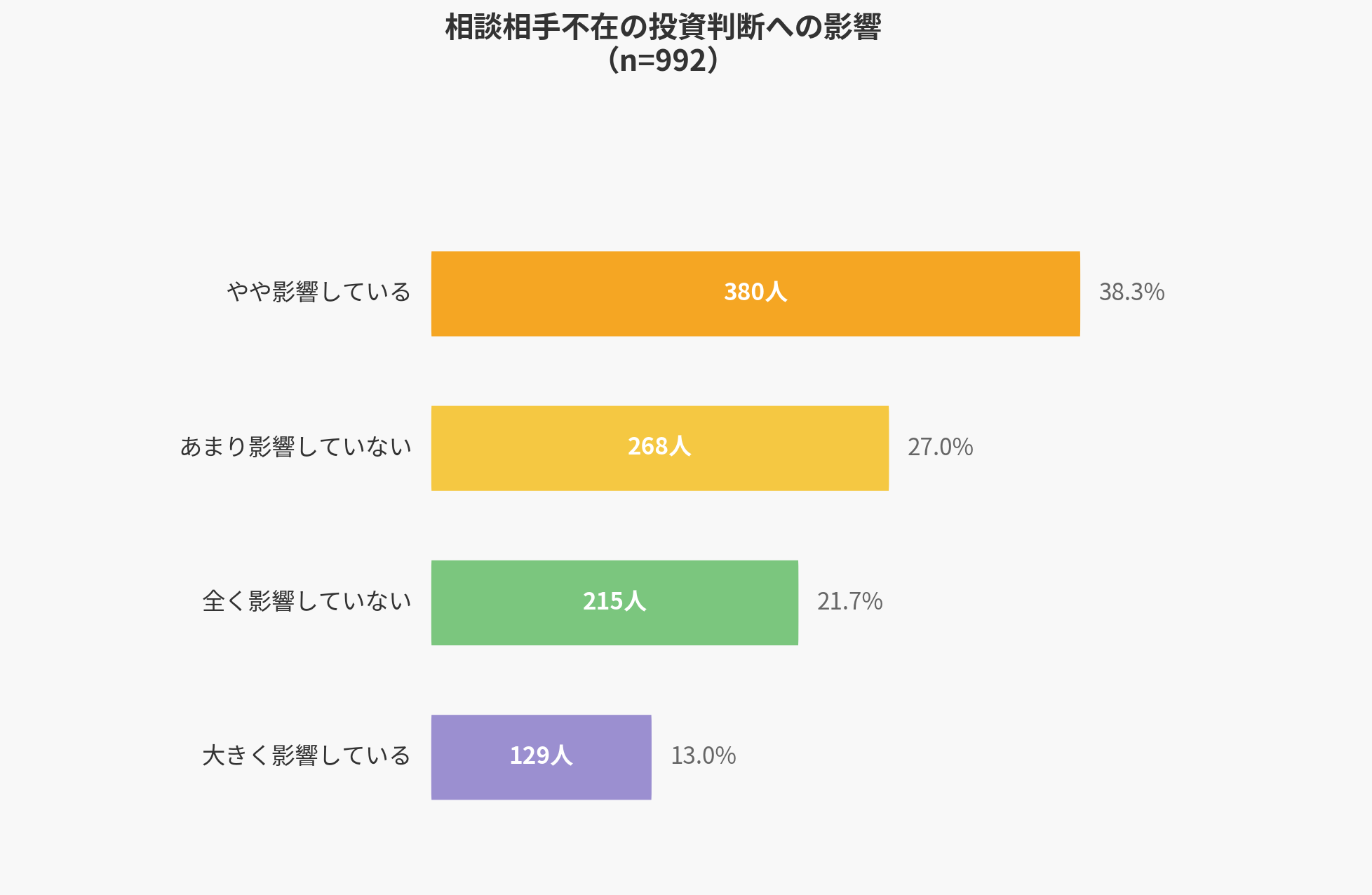 さらに、その半数以上が「相談相手の不在が投資判断に影響している」と回答しており、孤立が判断の迷いや不安に直結している様子が伺えます。