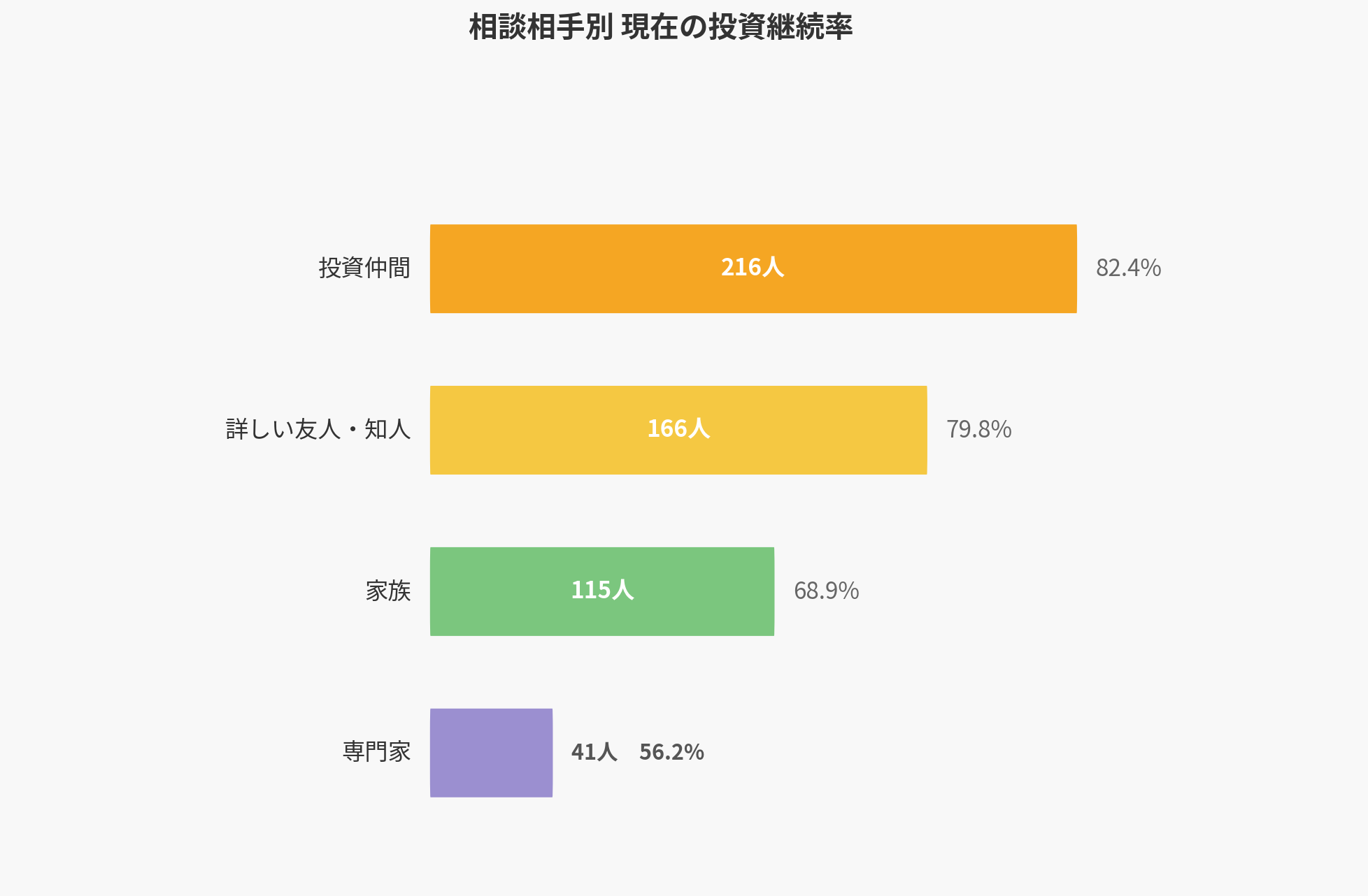相談相手の種類と現在の投資状況を照らし合わせると、オンラインコミュニティなどの「投資仲間」を持つ層の82.4%が現在も投資を継続していることが分かりました。