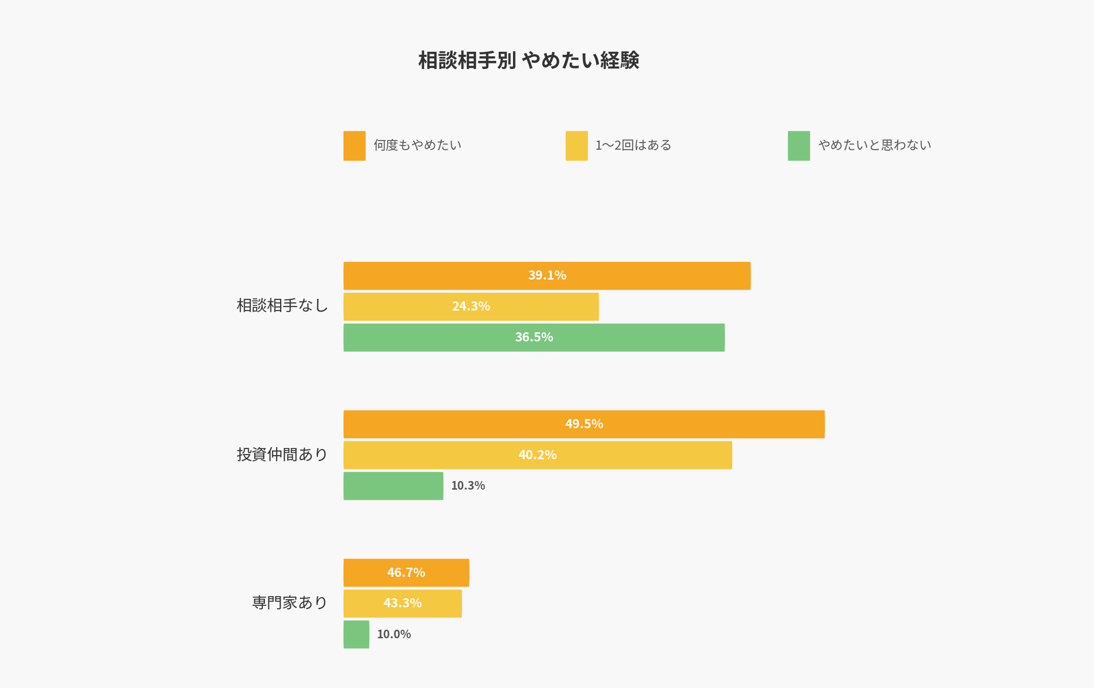 相談相手の種類別に「投資をやめたいと思った経験」を分析したところ、意外にも投資仲間がいる層の49.5%が「何度もやめたい」と回答しました。