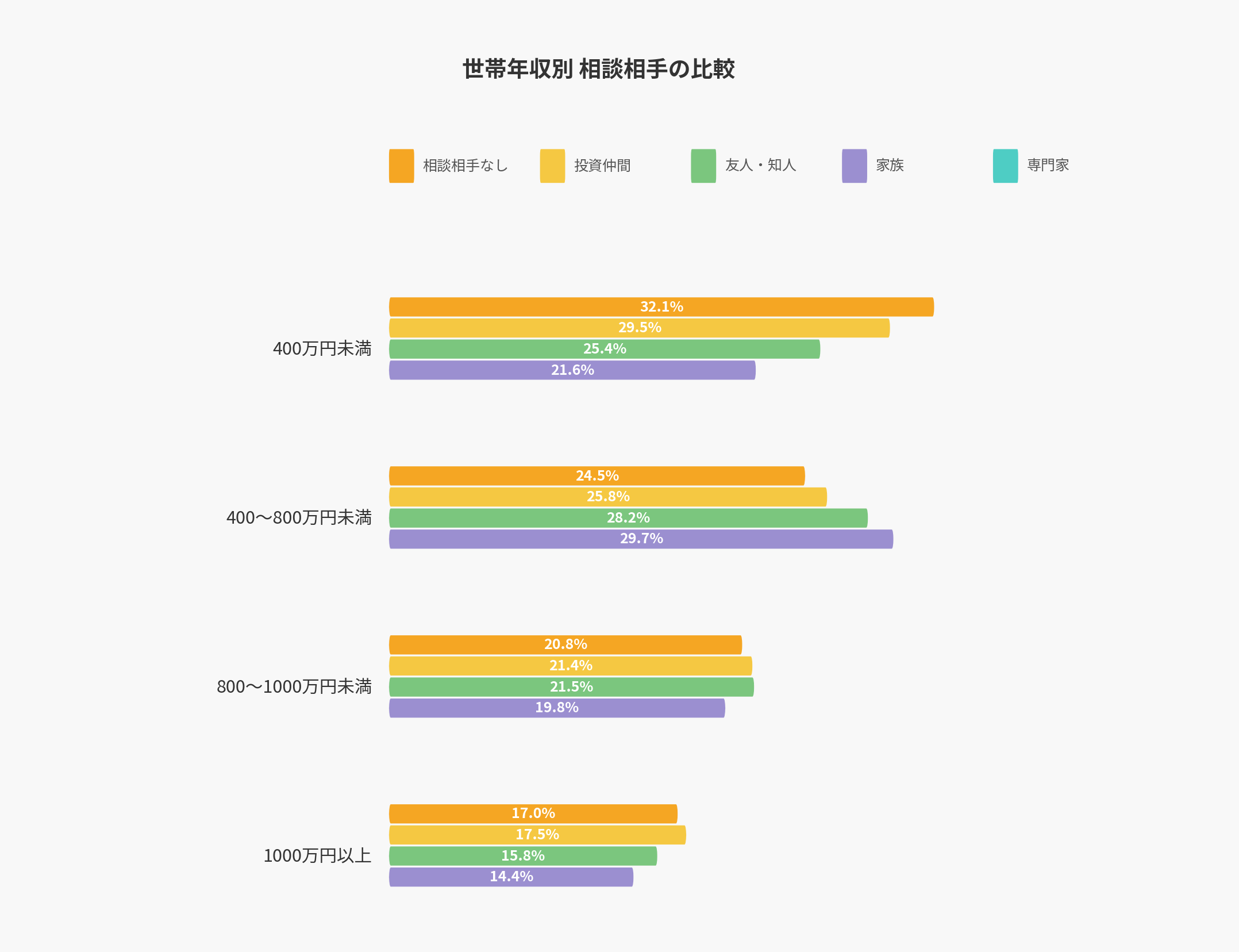 世帯年収 | 相談相手なし | 投資仲間 | 友人・知人 | 家族 | 専門家 |