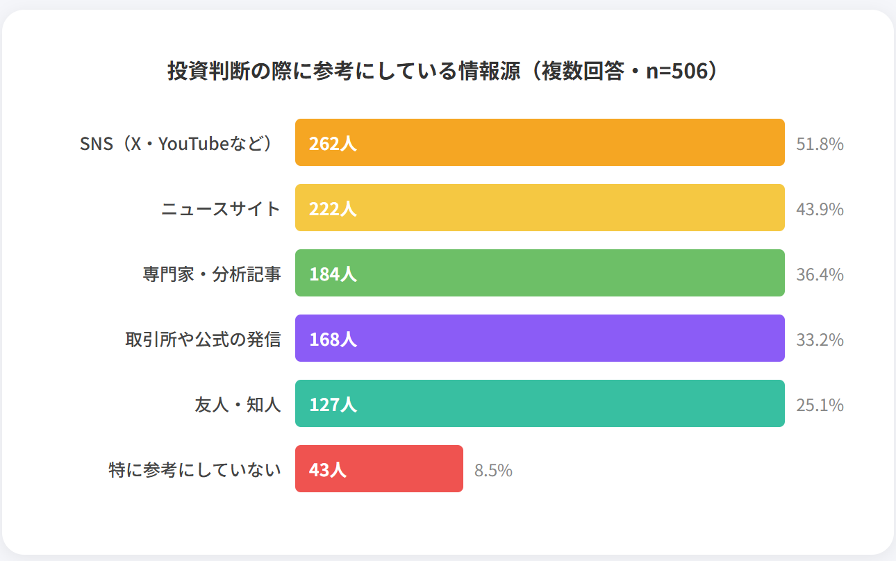 投資判断の際に参考にしている情報源として、「SNS(X、YouTubeなど)」が262人(51.8%)で最多でした。