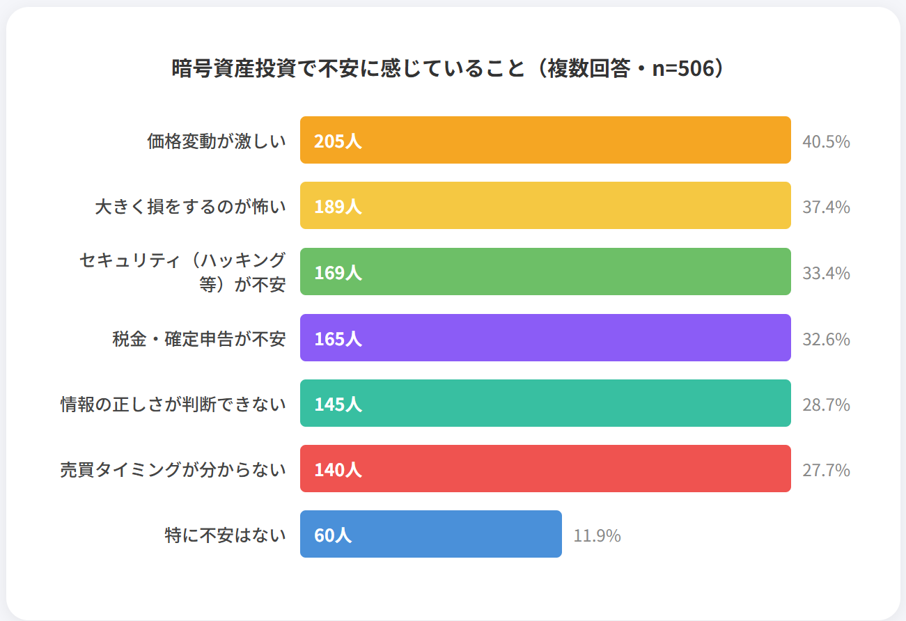 暗号資産投資で不安に感じていることを複数回答で尋ねたところ、「価格変動が激しい」が205人(40.5%)で最多でした。