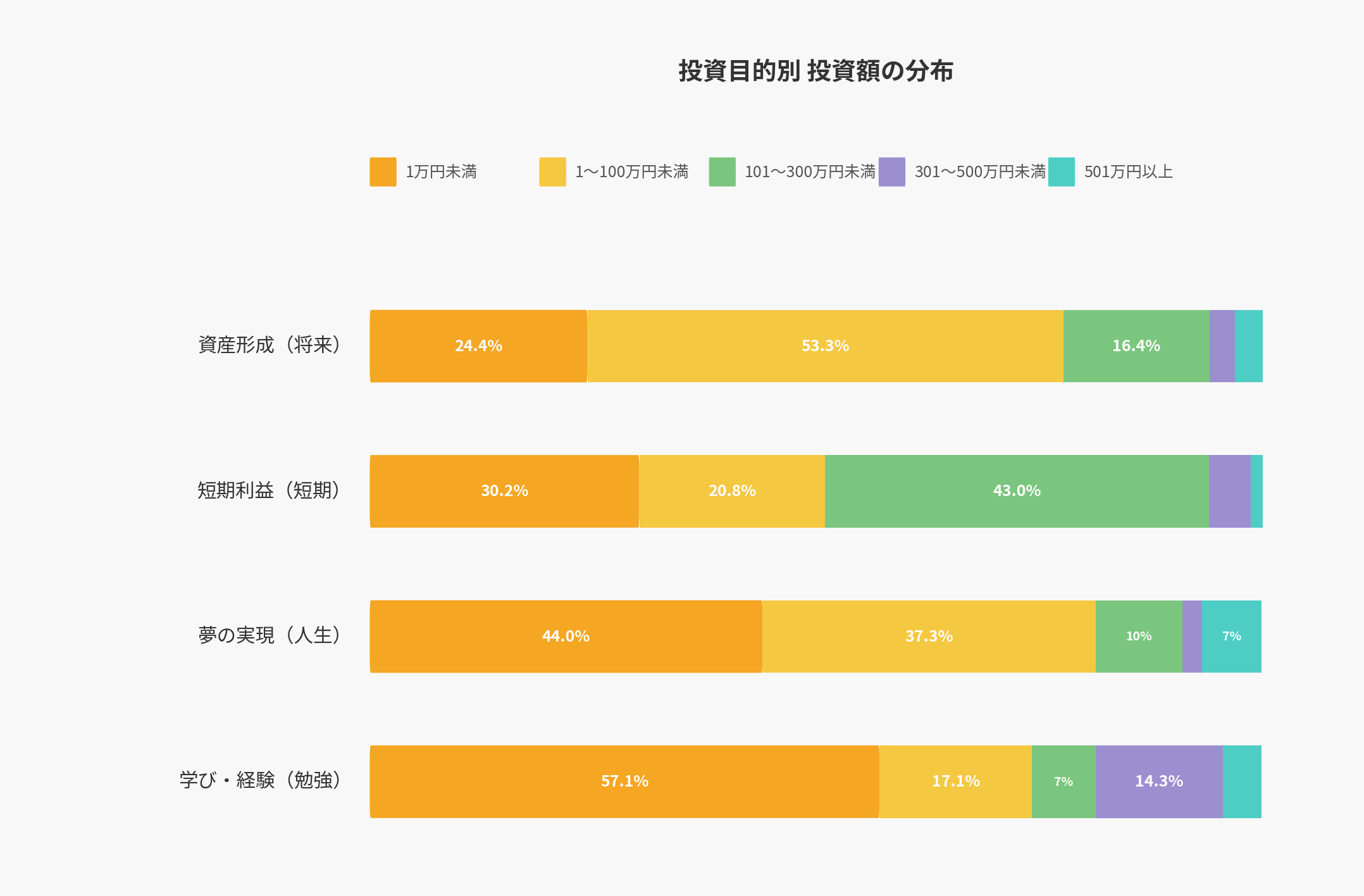投資目的 | 1万円未満 | 1〜100万円未満 | 101〜300万円未満 | 301〜500万円未満 | 501万円以上 |