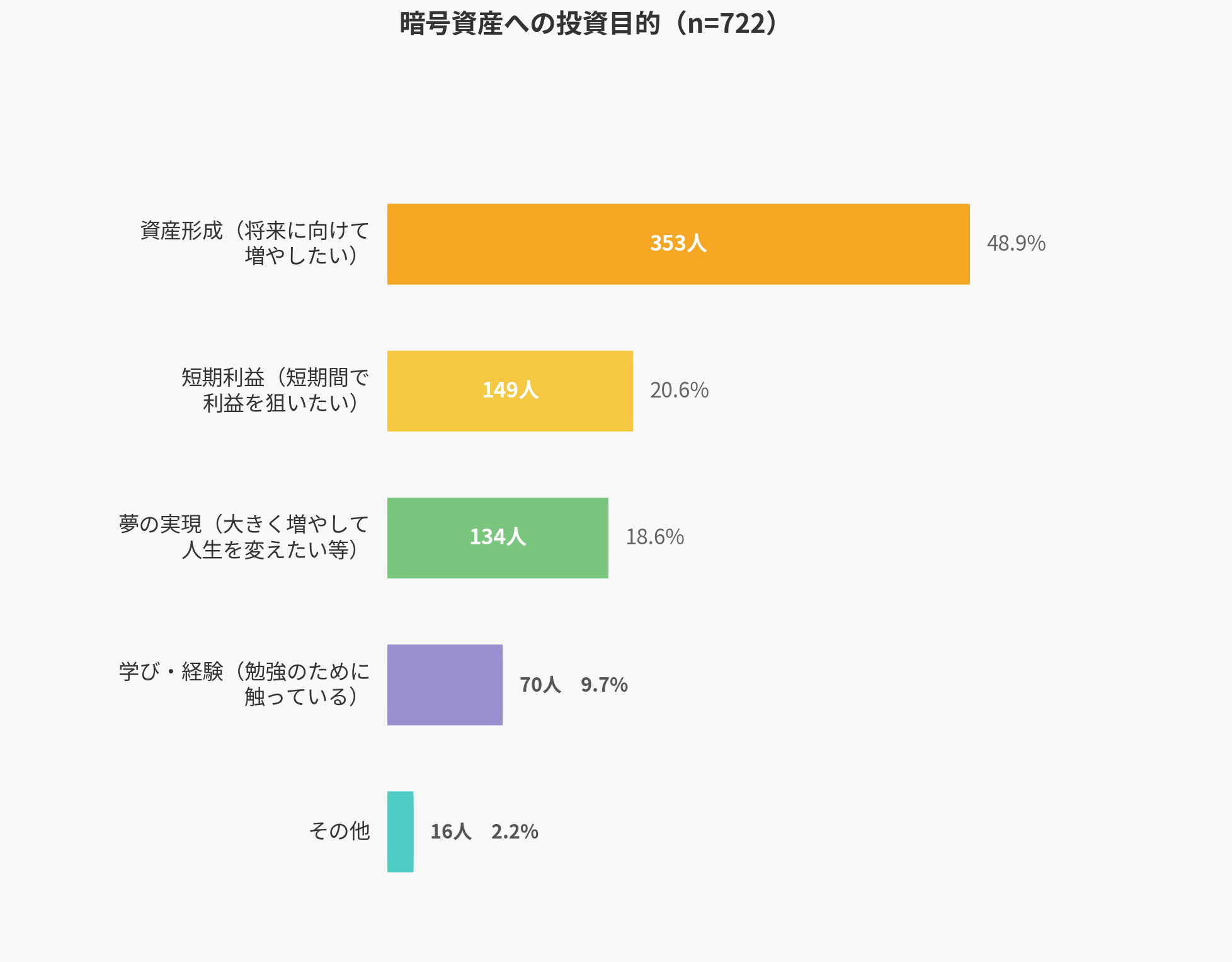暗号資産投資を行う目的を調査したところ、将来に向けた資産形成を挙げる層が48.9%と約半数に達しました。