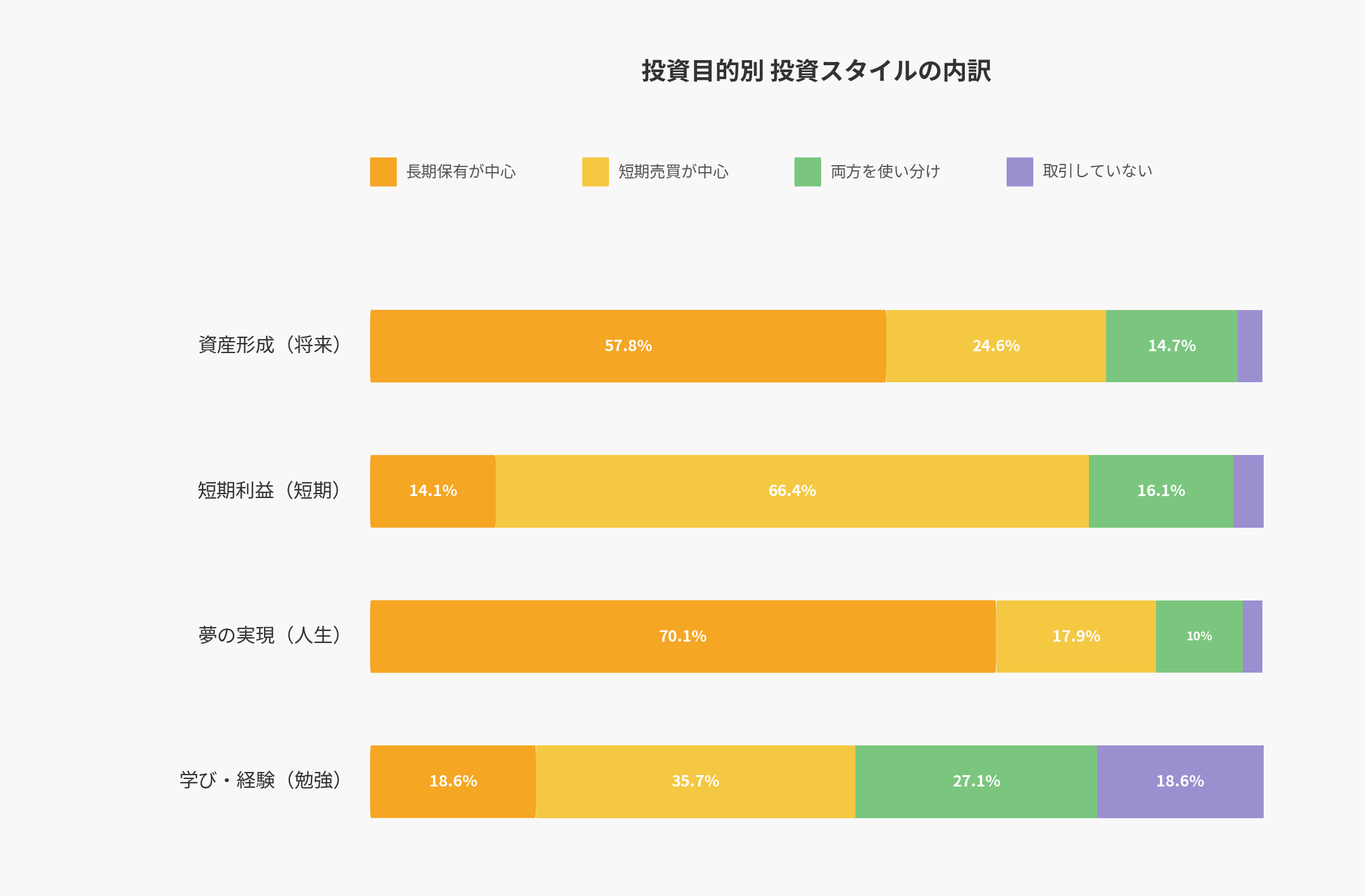 投資目的 | 長期保有が中心 | 短期売買が中心 | 両方を使い分け | 取引していない |