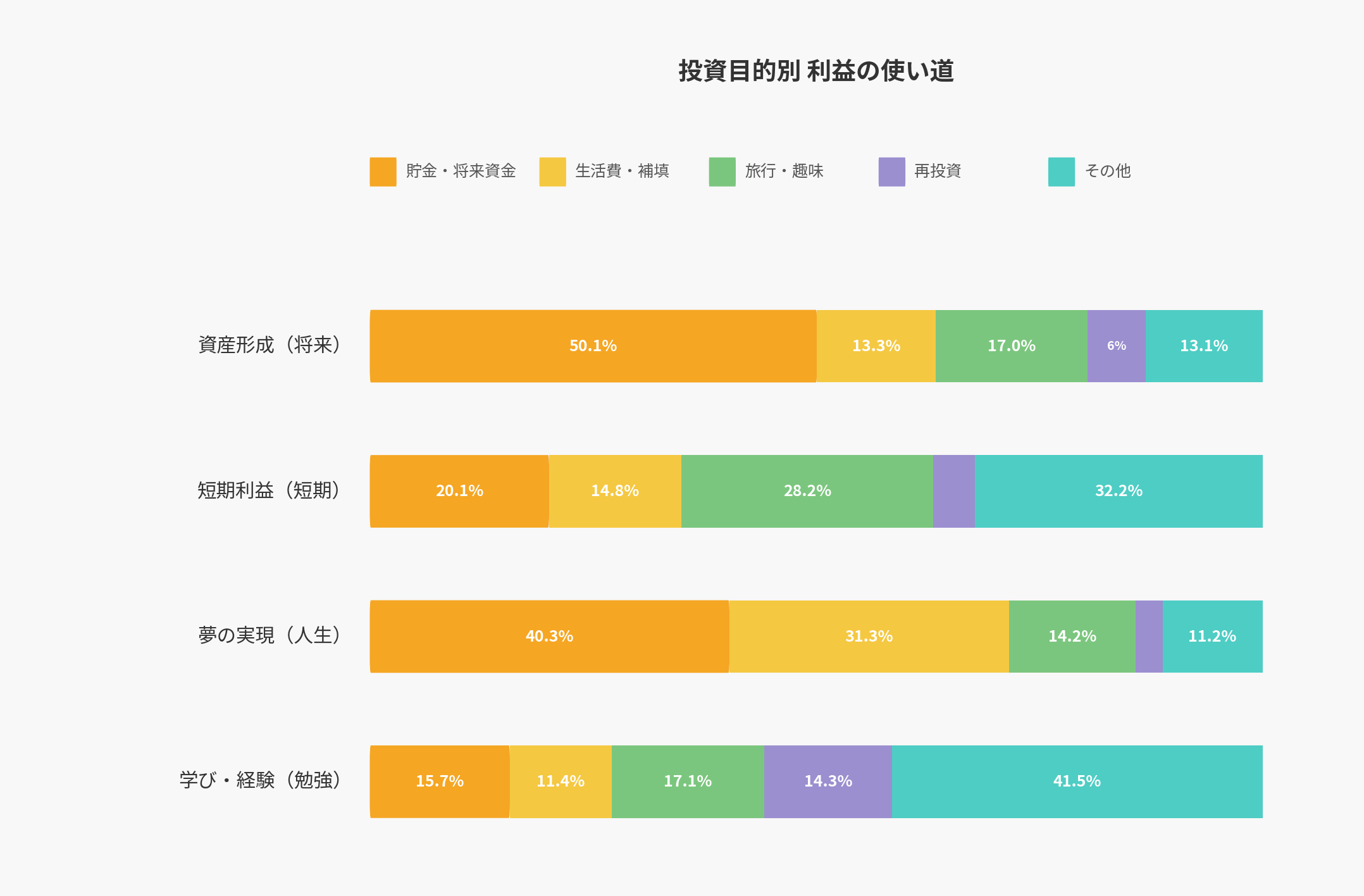 投資目的 | 貯金・将来資金 | 生活費・補填 | 旅行・趣味 | 再投資 | その他 |