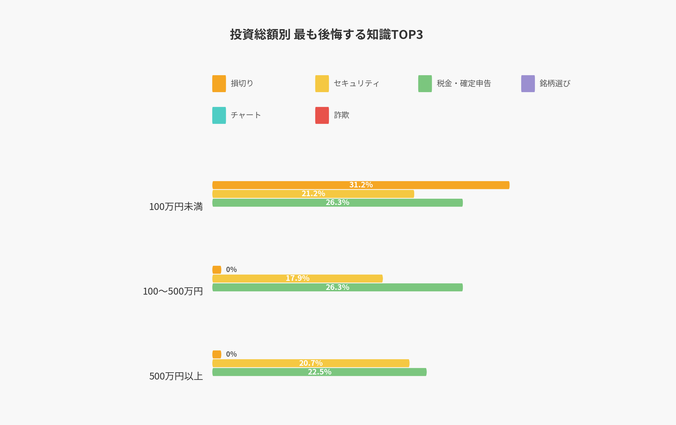 一方で、投資額が100万円を超えると損切りの割合は低下し、代わって税金の知識不足を悔やむ声が急増します。