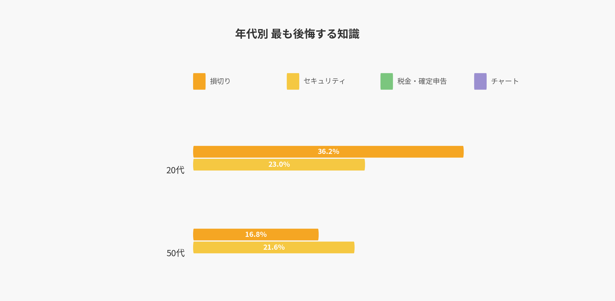 20代 | 149人 | 損切りのタイミング(36.2%) | セキュリティ管理(16.8%) | チャートの読み方(12.8%) |