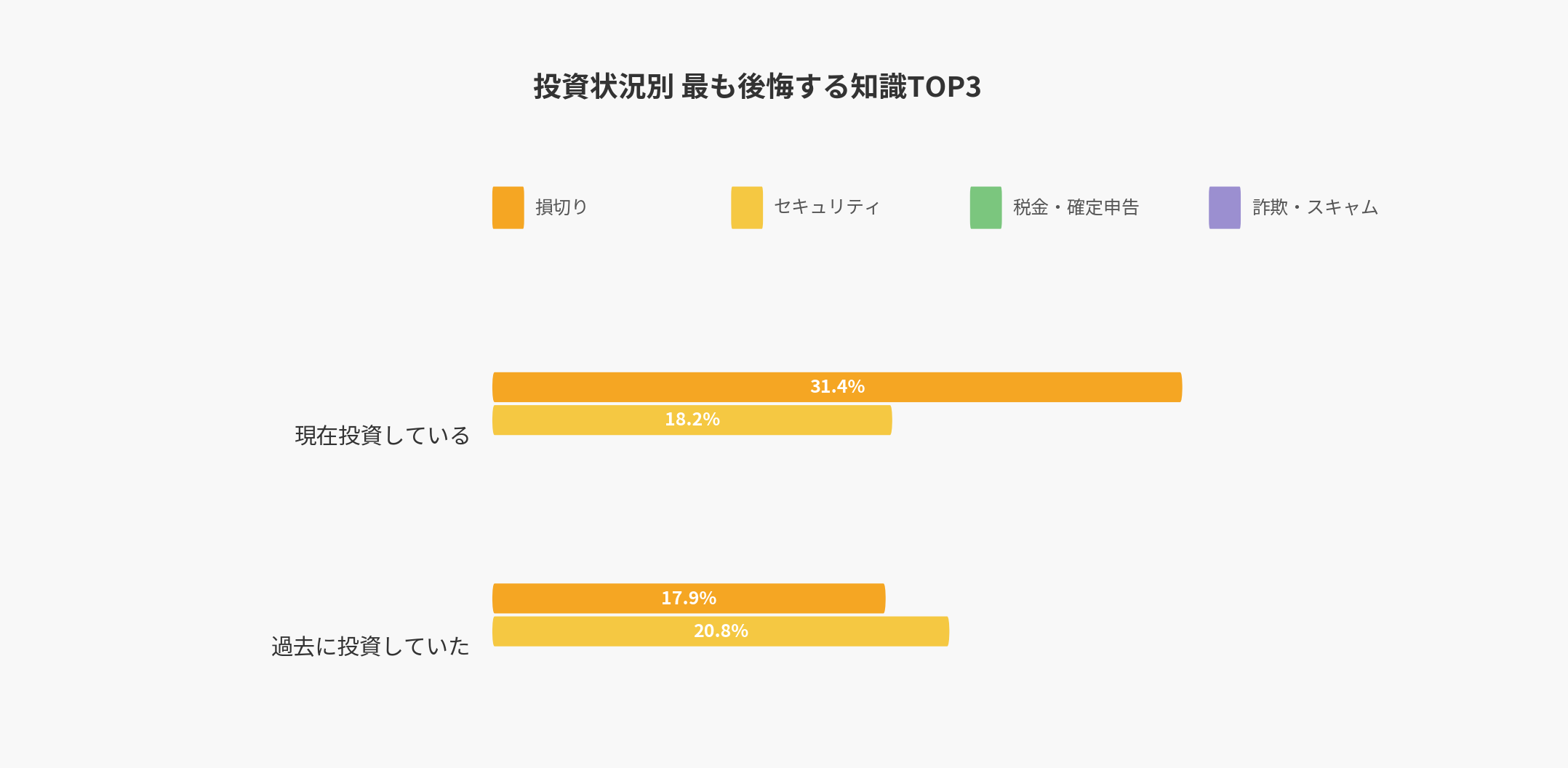 対照的に、すでに投資を辞めた離脱層では、セキュリティ管理(20.8%)や詐欺・スキャム(19.9%)への後悔が上位を占めています。