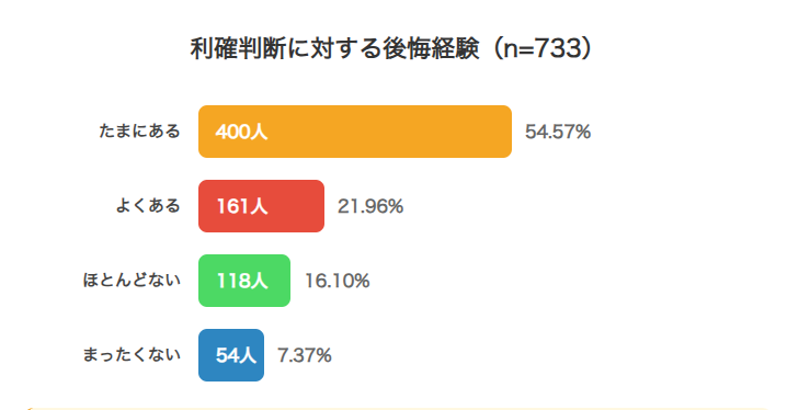 利確判断に対する後悔経験を尋ねたところ、「たまにある」が54.57%で最も多く、「よくある」の21.96%と合わせると76.53%が後悔を経験していました。