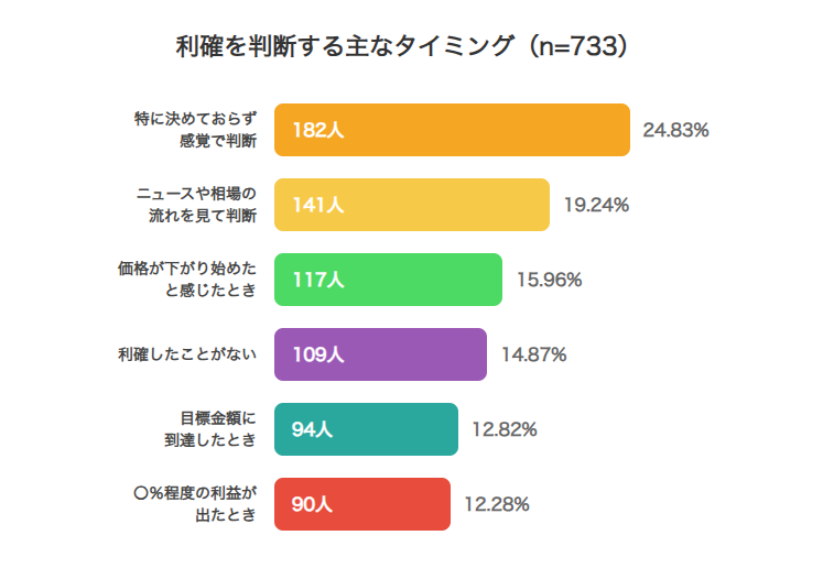 利確を判断する主なタイミングとして最も多かったのは「特に決めておらず感覚で判断」の24.83%で、約4人に1人が明確な基準を持たないまま売却を行っていました。