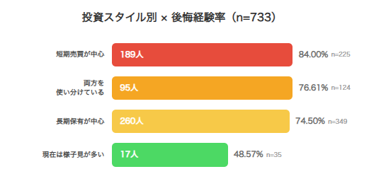 長期保有が中心の投資家でも後悔率は74.50%に達していますが、「よくある」が27.51%と全スタイルで最も高い点が興味深いです。