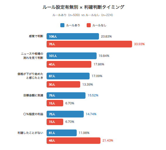 数値基準の有無が、利確のタイミングだけでなく「利確に踏み切れるかどうか」自体を左右している構造が浮かび上がりました。