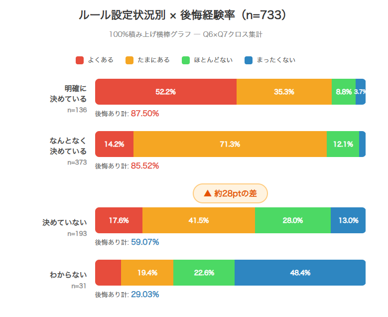 ルール設定者の後悔率87.5%、非設定者と28pt差