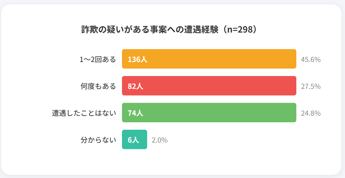 特筆すべきは「何度もある」と回答した層が27.5%に達している点です。これは、特定のユーザーが繰り返し詐欺の標的となっている、あるいは攻撃者が無差別に接触を試みている現状を示唆しています。