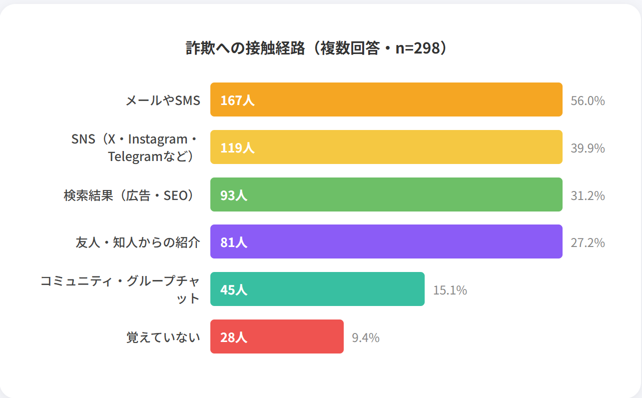 詐欺手口に遭遇した経路としては、「メールやSMS」が56.0%で過半数を超え、最も高い割合を記録しました。古典的な手段でありながら、直接的にユーザーの端末へメッセージを送り込めるメールの脅威は、今なお暗号資産市場において最大級と言えます。