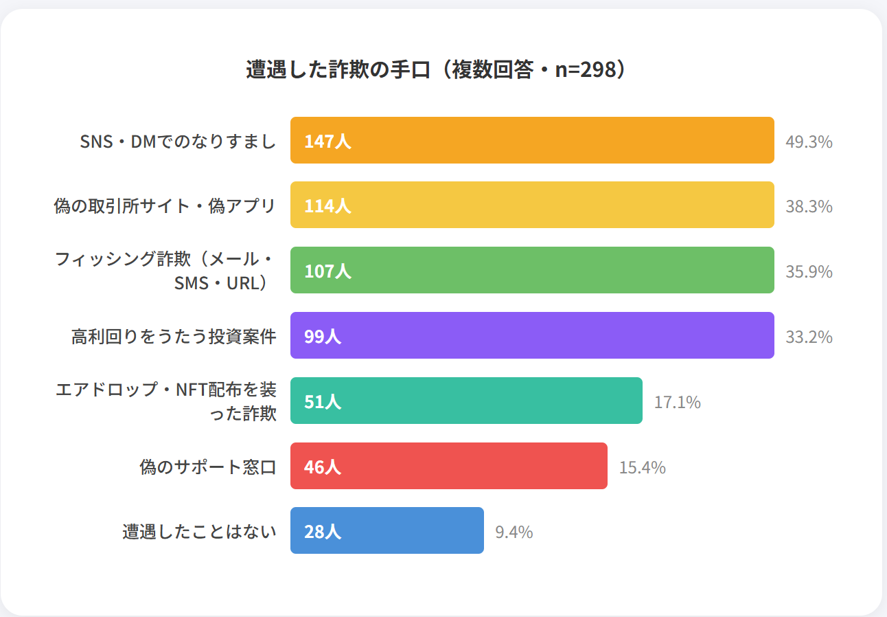 1年以上の経験を持つ層では、「遭遇したことはない」の割合が2割以上に上昇しており、一定のスクリーニング能力が備わっていることがうかがえます。しかし、経験3年以上のベテラン層でも約7割が遭遇を経験しており、暗号資産を扱う以上、逃れられないリスクとして定着しています。