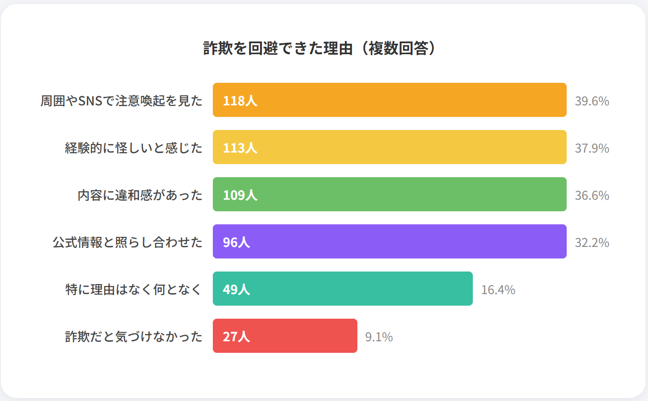 詐欺を回避できた具体的な理由として、最も多く挙げられたのは「周囲やSNSで注意喚起を見た(39.6%)」でした。他者の被害事例やプラットフォーム上での警告情報が、リアルタイムの防御策として機能している実態が明らかになりました。