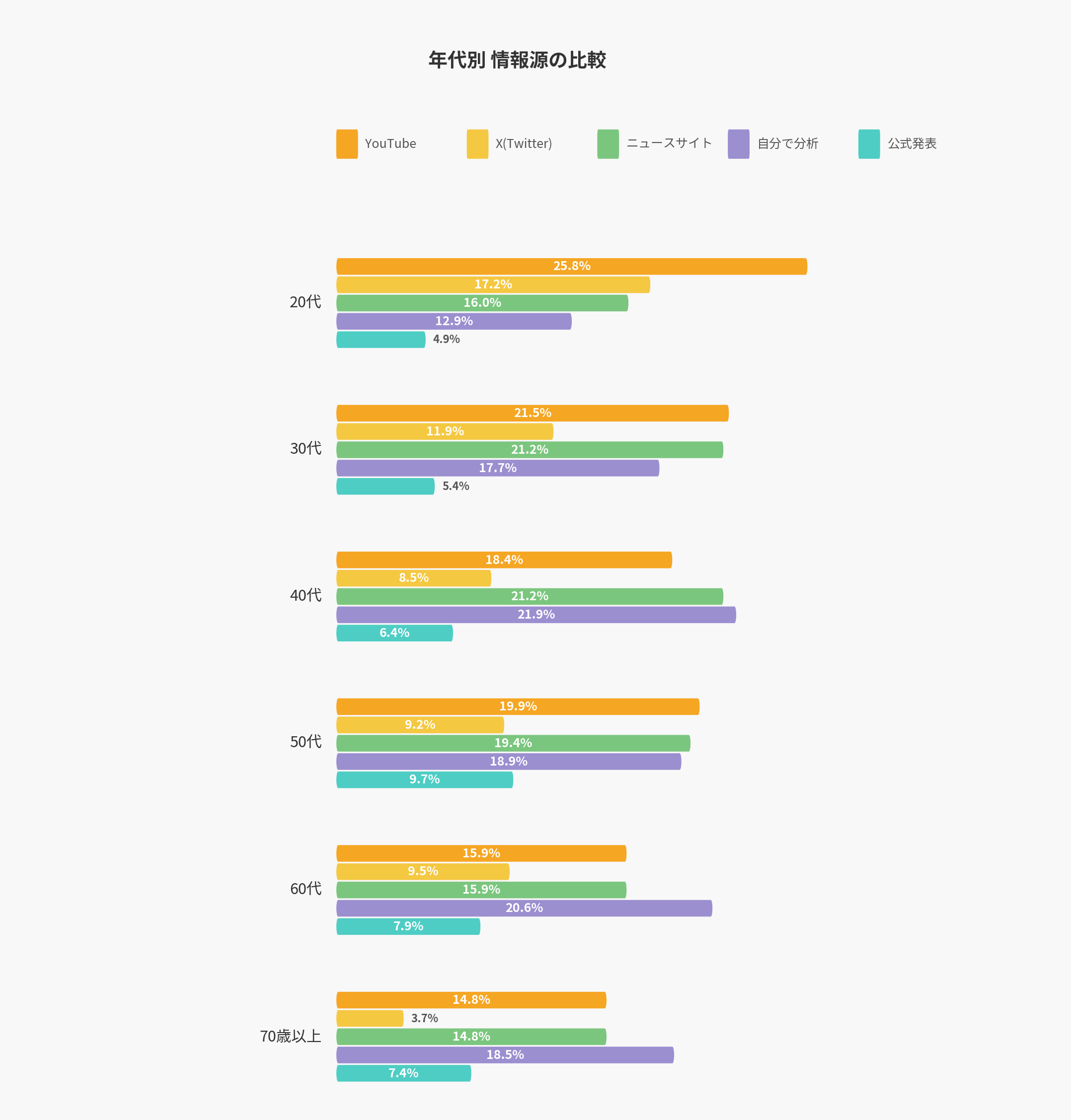 これは高齢層ほど公式発表や専門メディアを重視する傾向があり、情報の即時性よりも確実性を優先している結果であると推察されます。