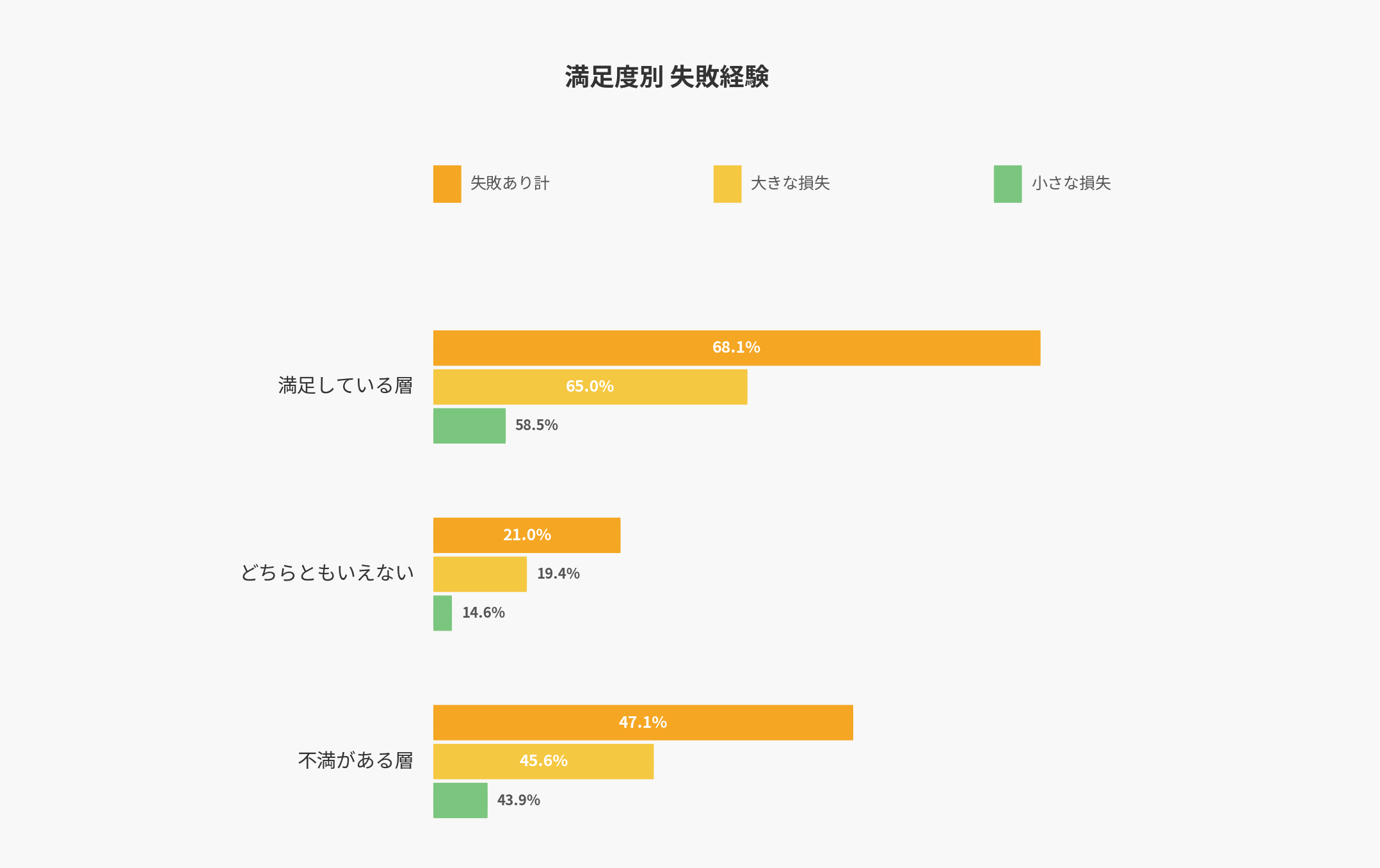 「満足している」と答えた層の失敗率は68.1%に達しており、不満を感じている層の58.5%を大きく上回る結果となっています。