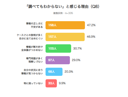 全体で46.9%が「ケースごとの説明が多く、自分に当てはめにくい」ことを障壁として挙げました。