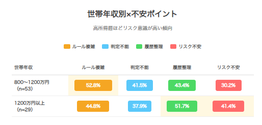 世帯年収別 | ルール複雑 | 判定不能 | 履歴整理 | リスク不安 |