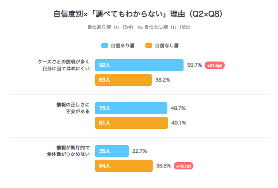 自信がない層ほど、正確な一次情報より「分かりやすさ」を優先し、結果として誤った情報に触れるリスクを高めています。