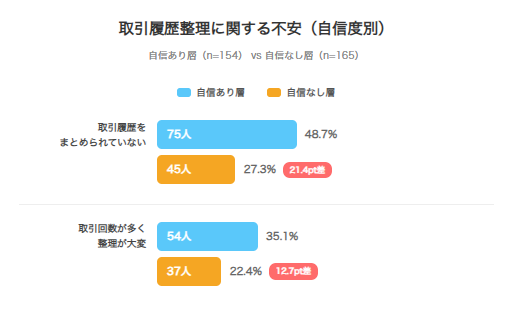 自信あり層の48.7%が履歴管理を不安視しており、自信なし層を大きく上回る結果となりました。