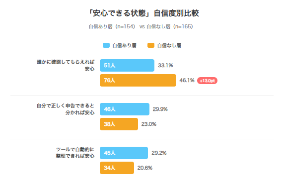 自信なし層の46.1%が「誰かに確認してもらえれば安心」と回答し、全項目で突出しました。
