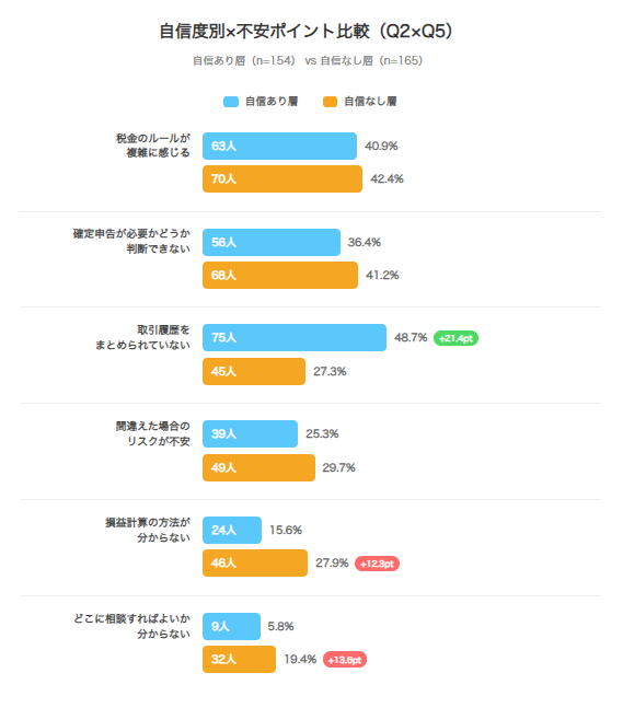 自信がない投資家は、損益計算のやり方や申告要否の判断という初期段階で足踏みしており、その不安を解消するために「誰かに確認してほしい」という切実なニーズを抱えています。