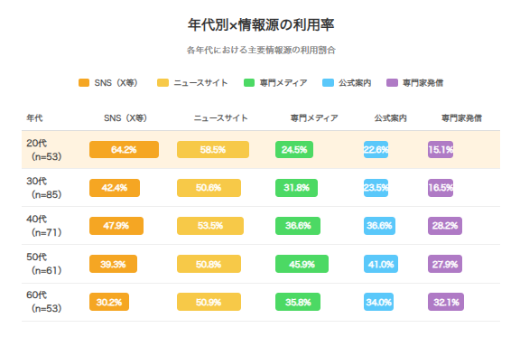 10歳刻み年齢 | SNS(X等) | 割合 | 公式案内 | 割合 | 専門家発信 | 割合 |