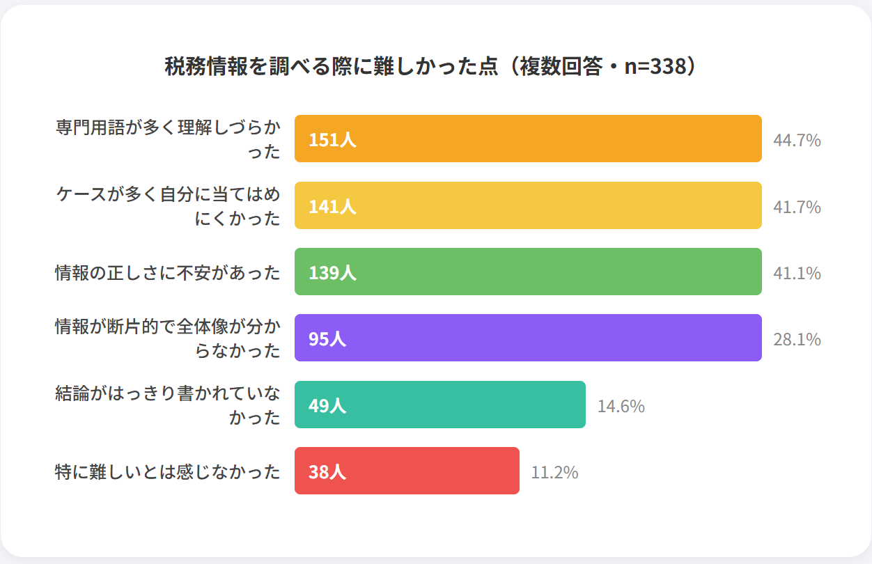 次いで「基礎知識の不足」が26.50%、「自身のケースへの不適合」が23.08%と続いています。これらは表裏一体の課題であり、土台となる税務知識が欠けているために、応用的な個別事例への対応が困難になっている構図が推測されます。また、13.68%の層が「情報の正しさを判断できなかった」と回答している点も重要です。法改正が頻繁に行われる分野であるからこそ、鮮度の低い情報や誤った言説に翻弄されるリスクを保有者が強く意識していることが伺えます。