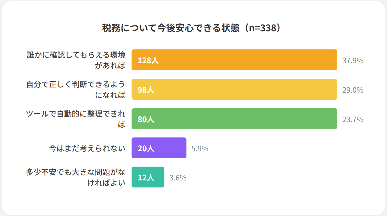 将来的にどのような状態になれば安心できるかという問いに対し、37.87%が「確認してもらえる環境」を求め、最多となりました。自力で完結させることの限界を感じ、税理士などの専門家やサポートサービスによる「答え合わせ」の場を欲している層が多いことを示しています。暗号資産の税務は判断を誤った際のリスクが大きいため、最終的な担保を他者に求めたいという切実な心理がうかがえます。