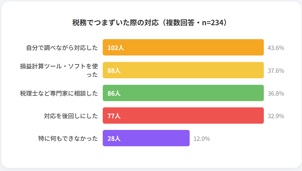 税務でつまずいた際の行動を調査したところ、「自分で調べながら対応した」が43.59%で最多となりました。多くの保有者が、まずは自力で解決を試みる自助努力の姿勢を見せています。また、損益計算ツールの利用(37.61%)や税理士への相談(36.75%)も高い水準にあり、計算の自動化や専門知識の活用といった実効性のある手段を選択する層が一定数存在することが分かります。