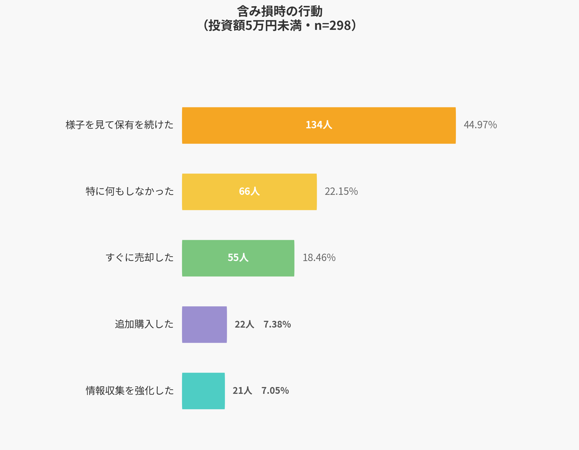 投資額が5万円未満の少額投資家層においては、含み損に対する行動が極めて特徴的な二極化を示しています。