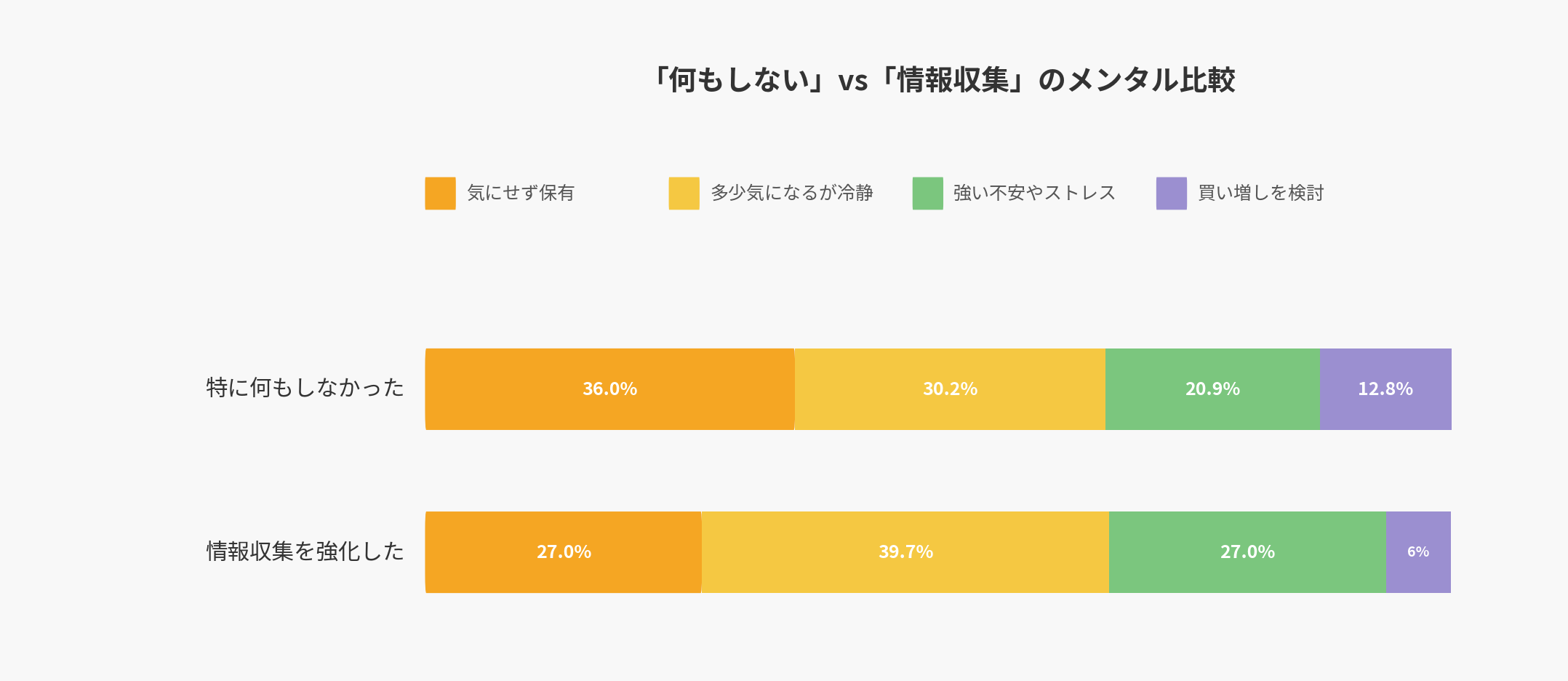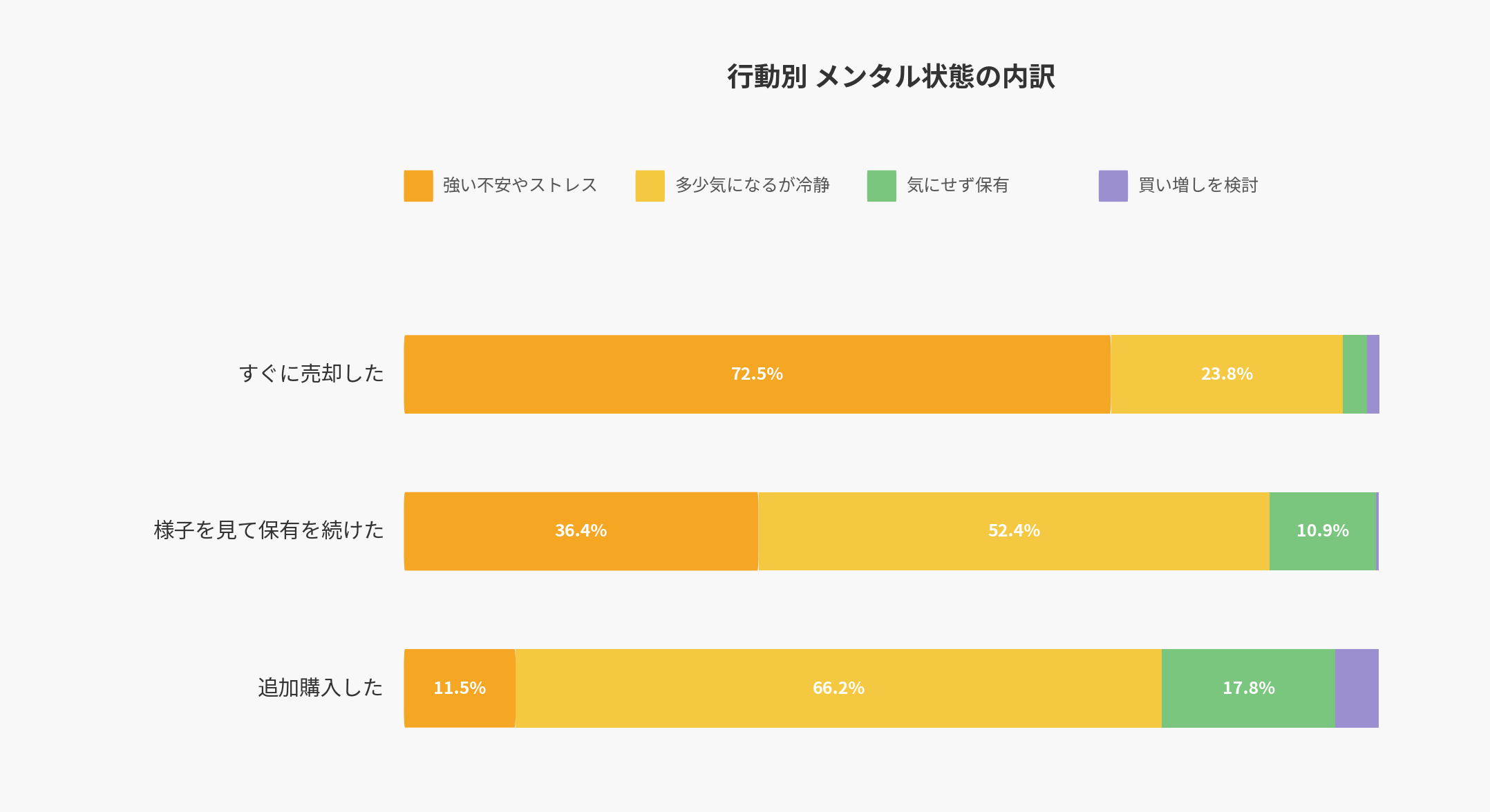 一方で、「追加購入(買い増し)」を行った層では、約66%が「多少気になるが冷静でいられる」と回答しており、対照的な結果となりました。