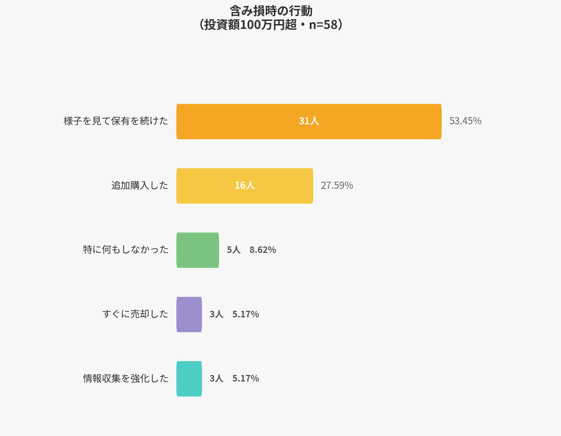 投資額が100万円を超えるトップ層では、半数を超える53%以上が「様子を見て保有を続けた」と回答しました。