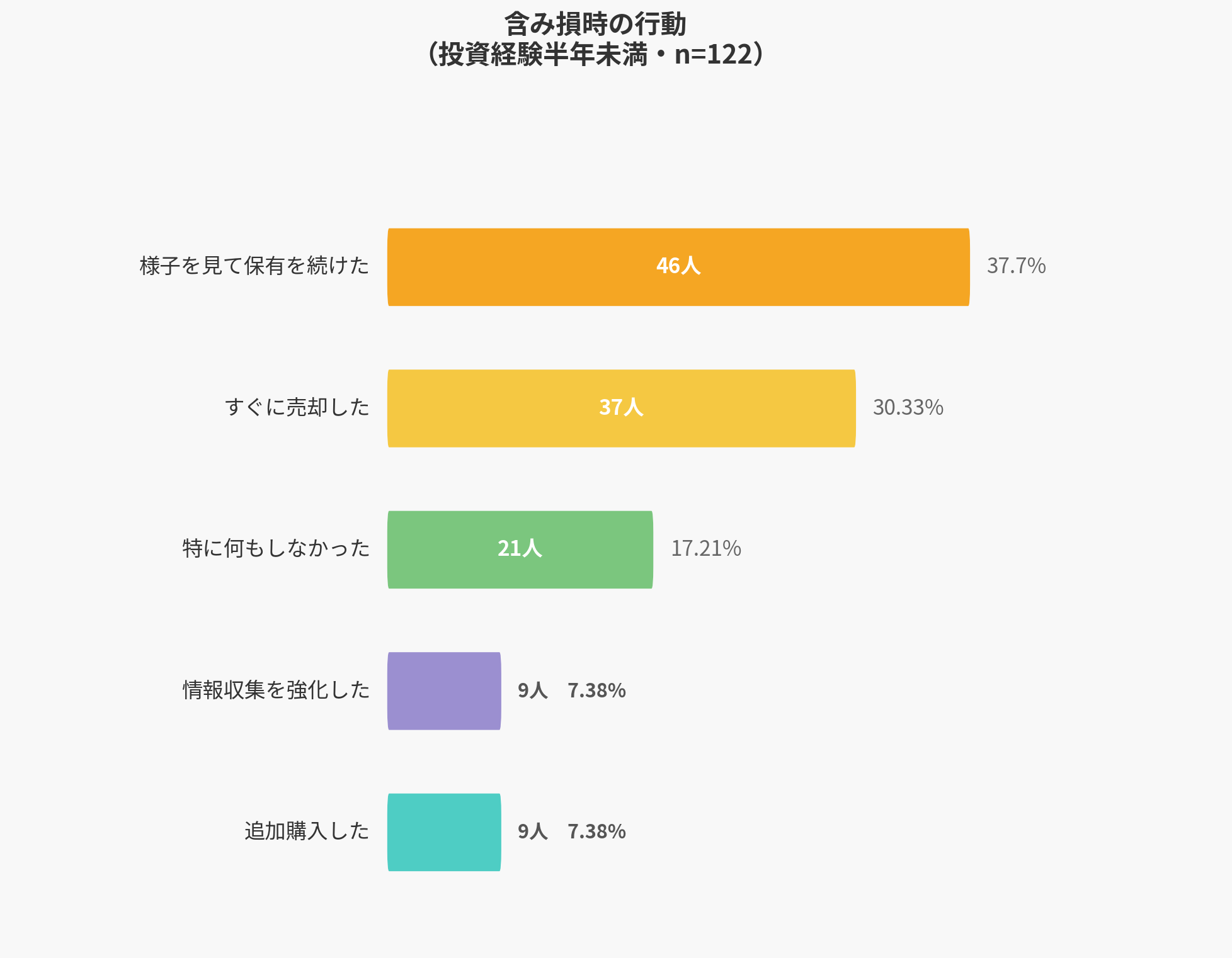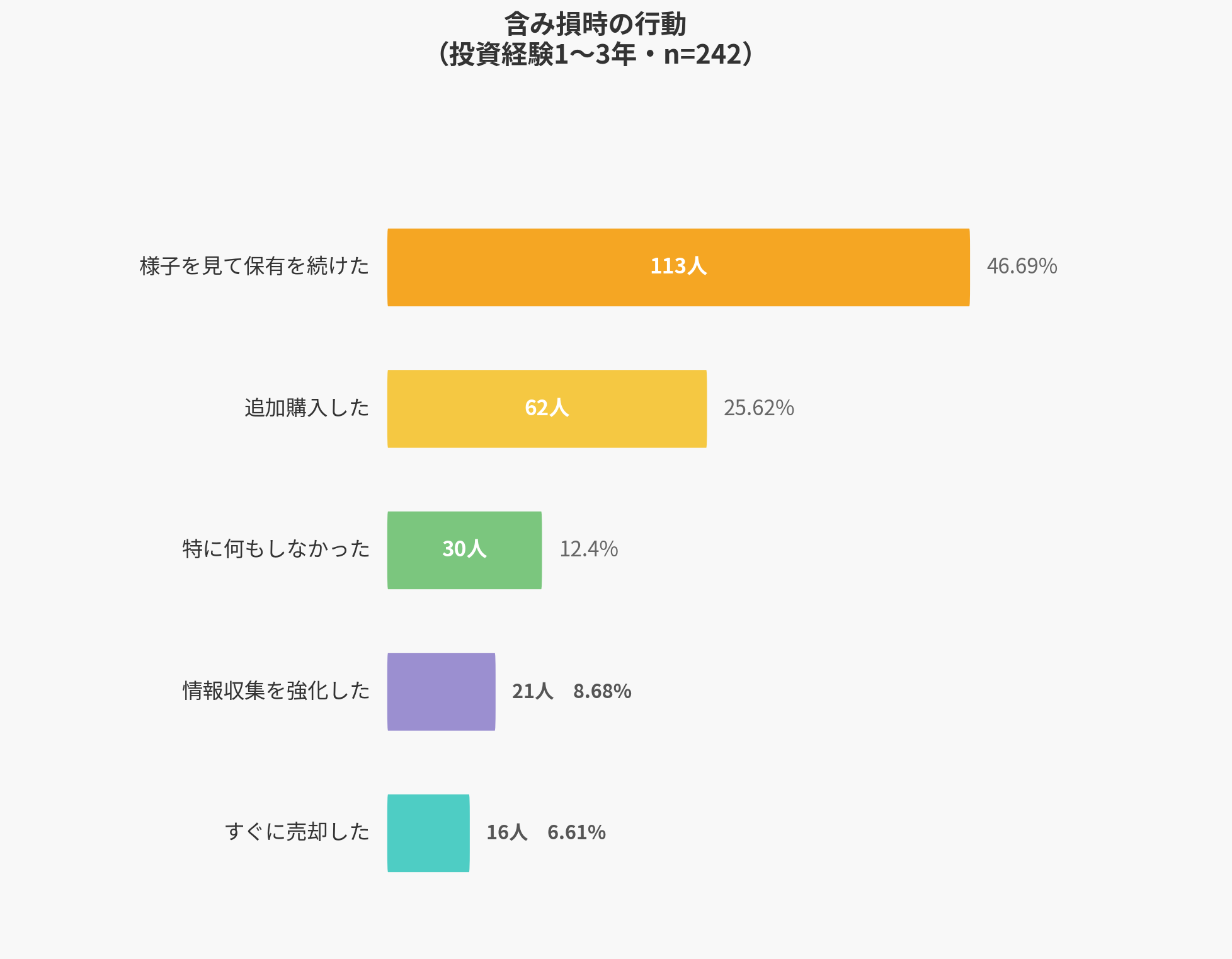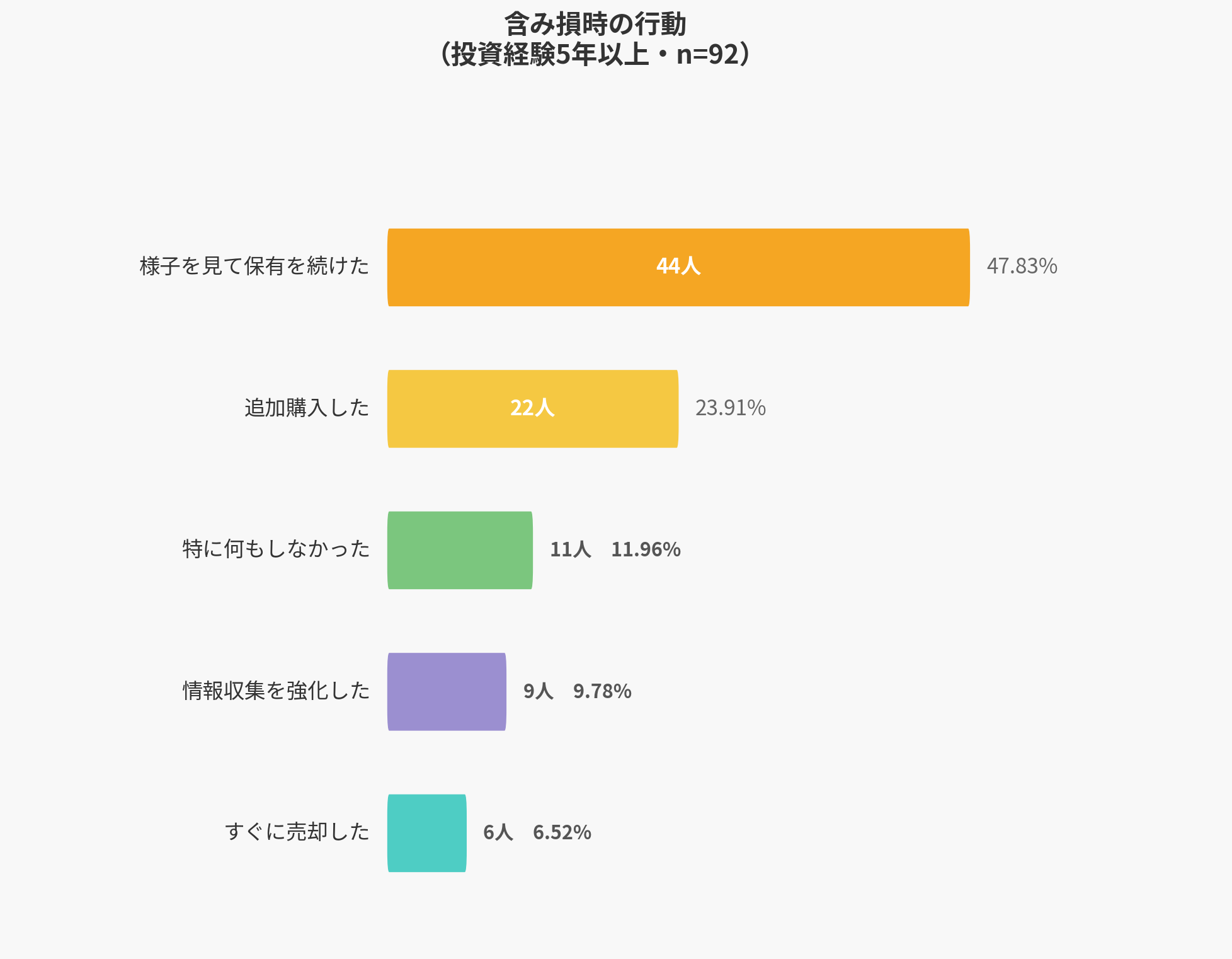 長期保有を掲げる層においては、約48%という半数近い投資家が「様子を見て保有を続けた」と回答しました。