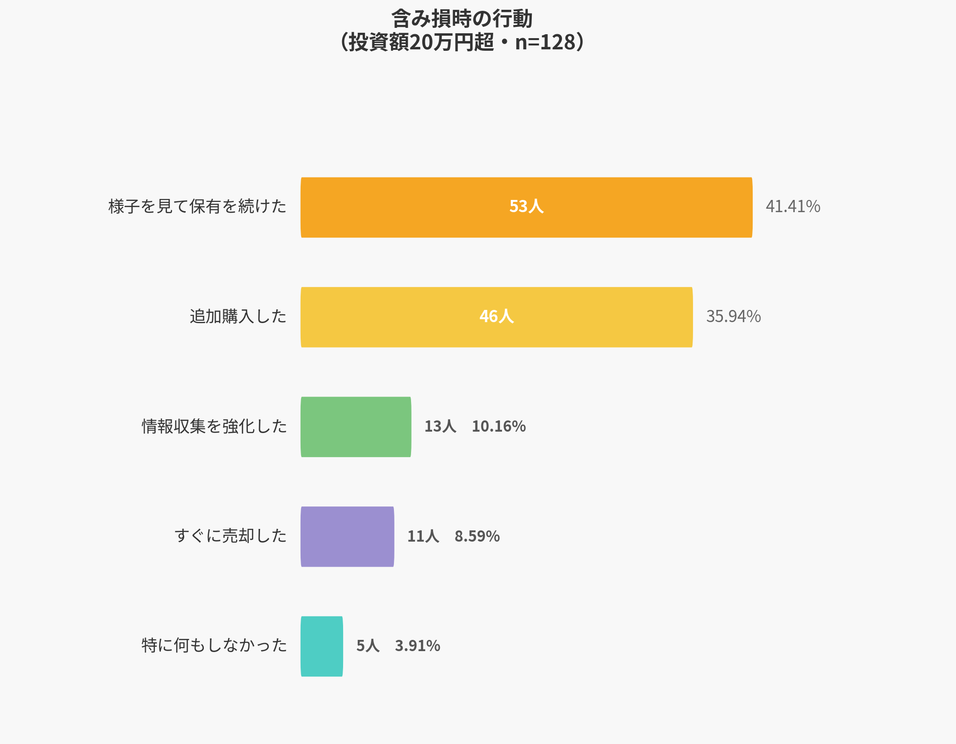 含み損が発生した際、投資額が20万円を超える層では「追加購入(買い増し)」を選択する割合が顕著に高まりました。