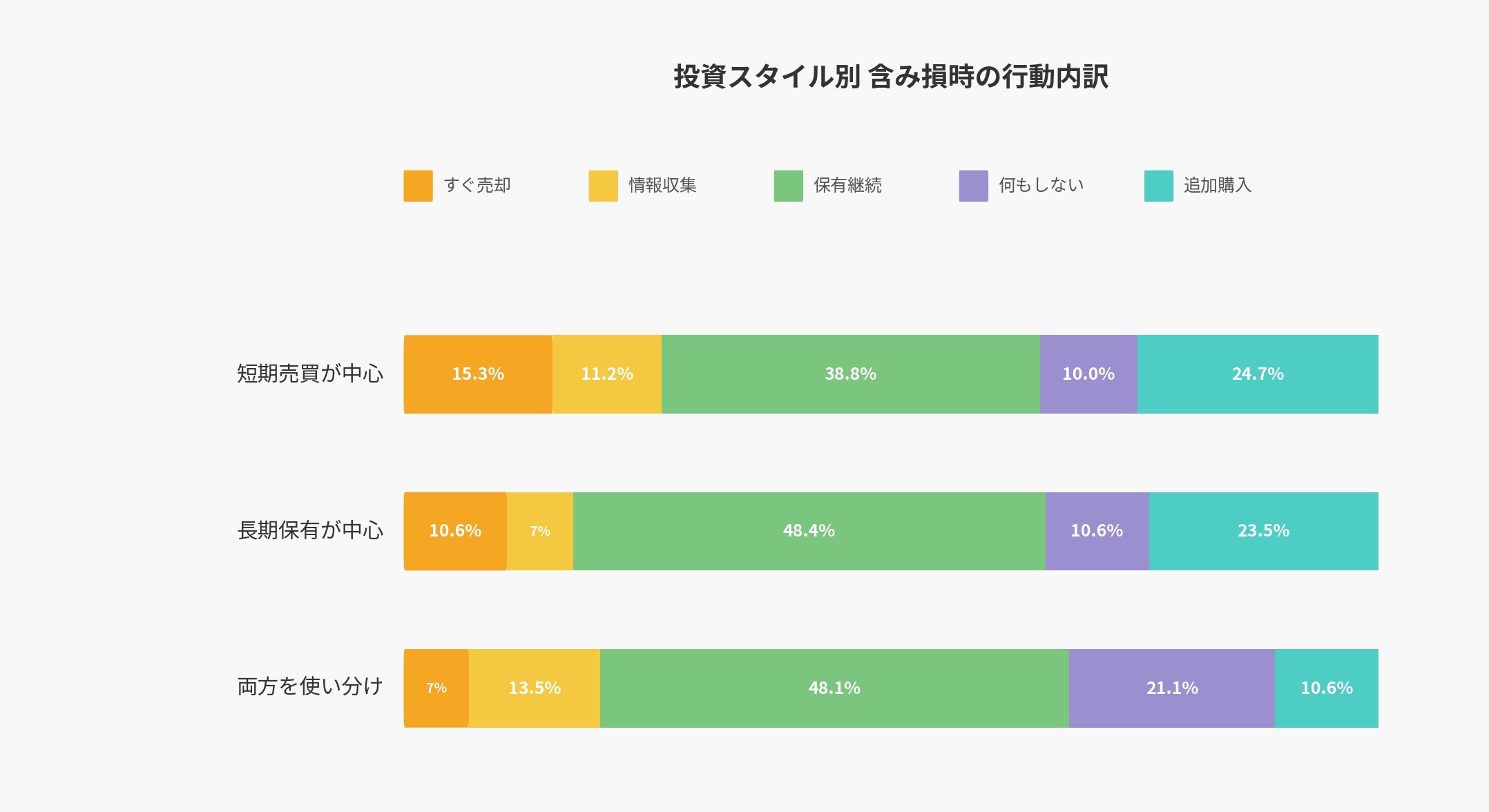 投資スタイル別に含み損時の行動を分析したところ、短期売買を主軸とする投資家の約15%が「すぐに売却」を選択しました。