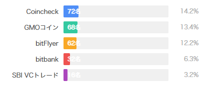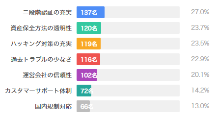 取引所を選択する際のセキュリティに関する信頼度は、複数の要因から形成されています。調査では「最も安全性に満足している取引所はどこか」という質問を行いました。結果は以下の通りです。