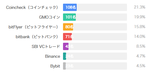 現在利用中の取引所を複数回答で聞いたところ、Coincheckが21.3%(108名)で最も多く利用されており、次いでGMOコイン19.9%(101名)、bitFlyer 15.8%(80名)という結果になりました。