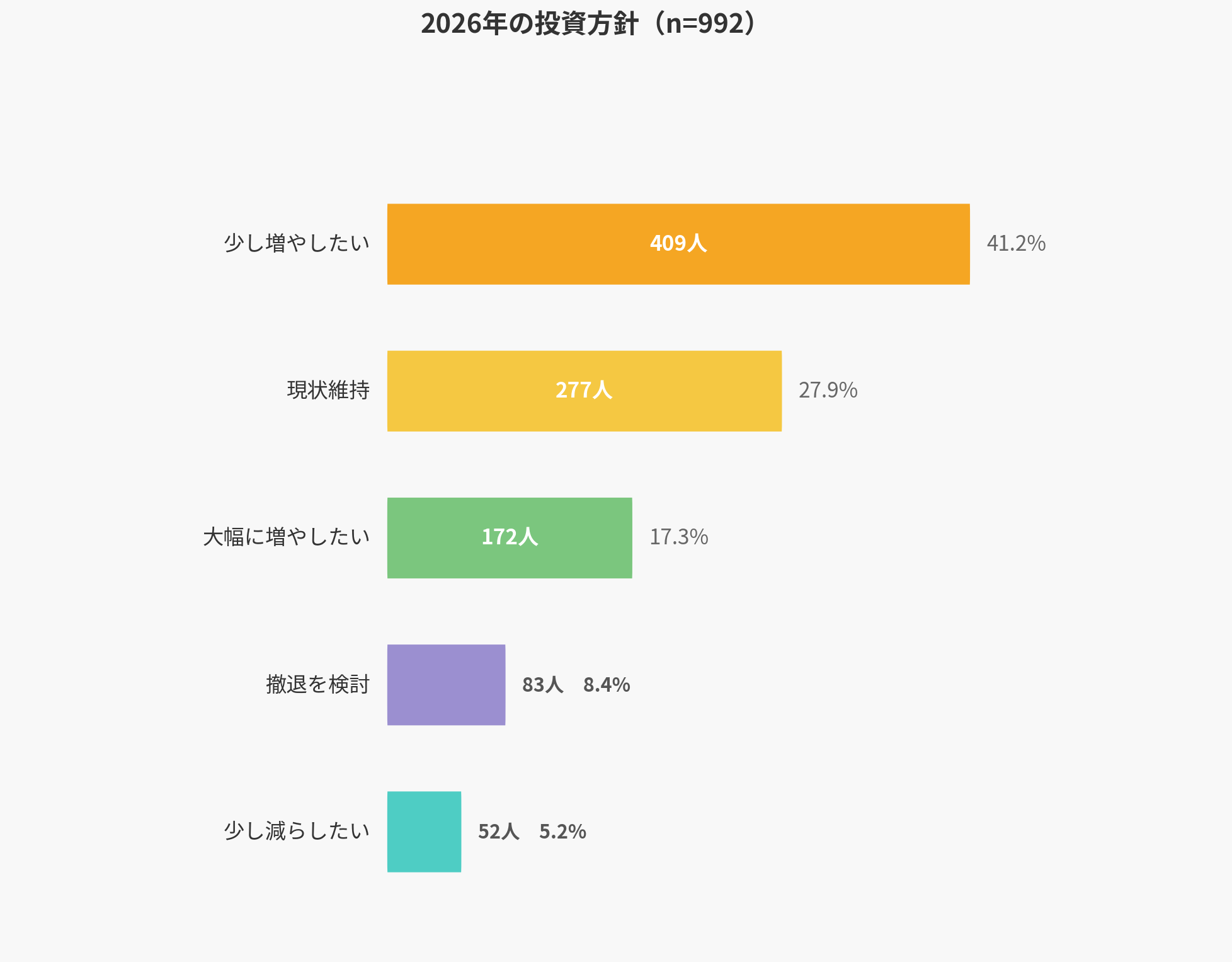 「大幅に増やしたい」の17.3%を合わせると、全体の58.5%が投資を拡大する意向を示しています。
